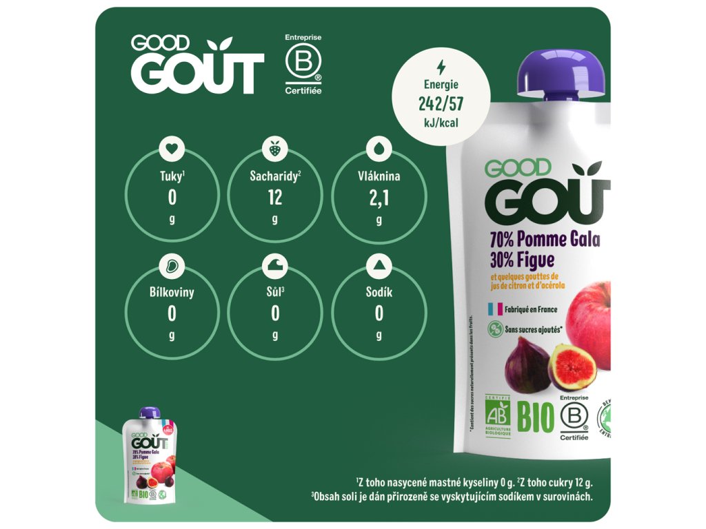 Detská výživa od ukončeného 4. mesiaca. Ovocný príkrm pre zvláštnu výživu dojčiat a malých detí. Pasterizované. Tepelne upravené. Zloženie: - 60 % bio jablká Gala - 40 % bio figy - koncentrovaná šťava z bio citrónov - bez lepku Skladovanie: Skladujte pri bežnej izbovej teplote. Po otvorení skladujte v chladničke a spotrebujte do 48 hodín. Odporúčaná príprava: Dobre pretrepte. Vylejte do misky alebo priamo na lyžicu. Dobrú chuť! Pre zdravie dieťaťa dodržujte návod na prípravu a pre skladovanie. Upozornenie: Nenechávajte deti do 36 mesiacov s viečkom bez dozoru. Nikdy nedávajte vrecko do mikrovlnnej rúry. - dodávateľ: Health Academy s.r.o., Zbraslavská 22/49, Malá Chuchle, 159 00 Praha 5 - výrobca: BBB - 23 rue Balzac - 75406, Paris Cedex - hmotnosť: 120 g - výrobok ekologického poľnohospodárstva - krajina pôvodu: vyrobené v Španielsku
