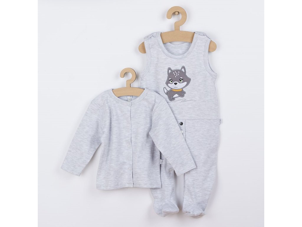 2-dielna bavlnená súpravička Koala Doggy. Súpravička obsahuje kabátik a dupačky. Je vhodná pre bábätká už od narodenia pre svoju jemnosť a mäkkosť. Dupačky zdobí roztomilý obrázok psíka. Obrázok je z vnútornej strany podlepený podšívkou proti poškriabaniu. Zapínanie majú na cvočky na ramienku a medzi nožičkami. Kabátik sa zapína na cvočky po celej dĺžke. Súprava s moderným dizajnom je vhodná pre dievčatká aj chlapčekov. Zloženie: 100% bavlna.