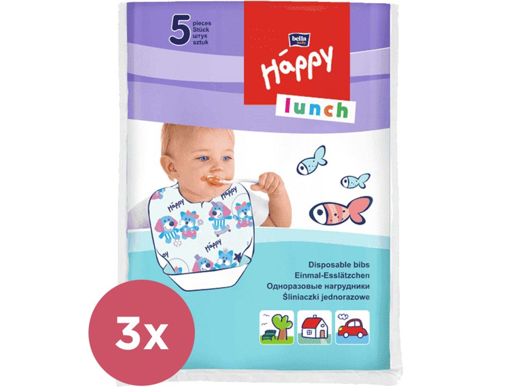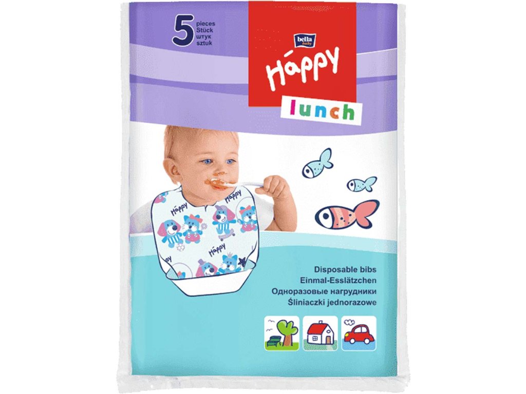 Jednorazové podbradníky Happy Lunch sú dokonalou alternatívou látkových podbradníkov. Vonkajšia savá vrstva z netkanej textílie spolu so zadnou fóliovou vrstvou skvele chráni odev dieťaťa pred znečistením.