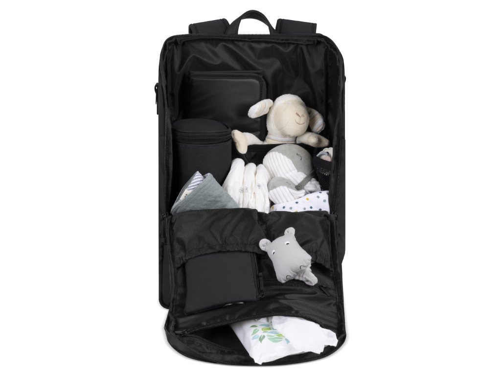 Na vnitřní straně jsou dvě kapsy - včetně přihrádky na mokré věci. Součástí je také hygienická přebalovací podložka na cesty, kapsa na sáčky a termoobal na lahve. Velká hlavní přihrádka otevíraná zepředu nabízí dostatek prostoru - ideální na nákupy ve městě nebo na dlouhou procházku.
