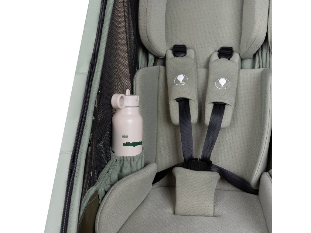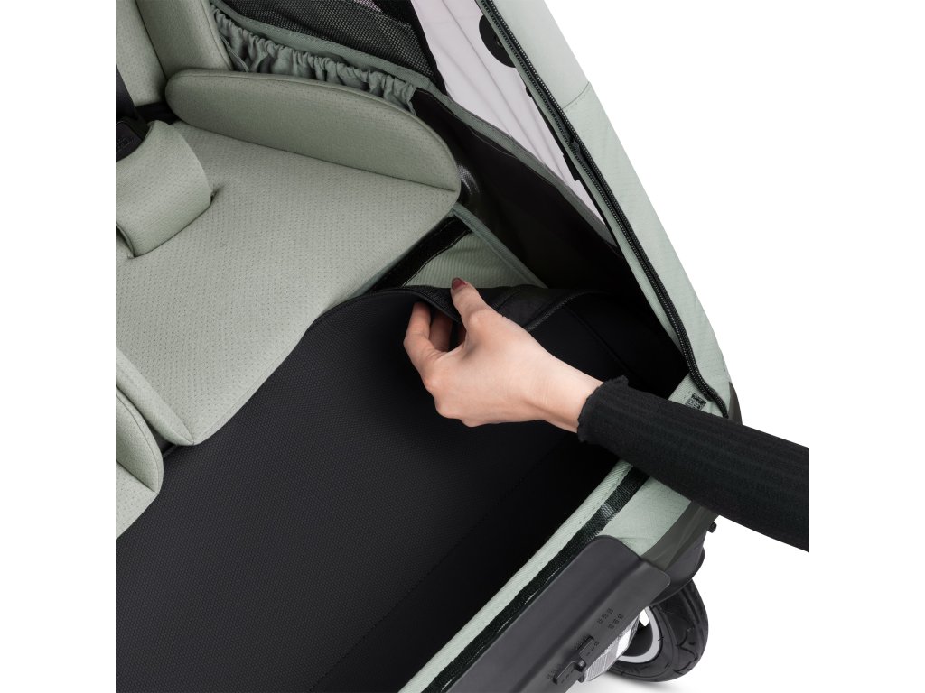 Vozík nabízí také praktické funkce: odnímatelná taška v prostorném kufru, integrovaná stříška 3v1 s moskytiérou, ochranou proti dešti a stříkající vodě a nastavitelná sluneční stříška s ochranným faktorem UPF 50+.