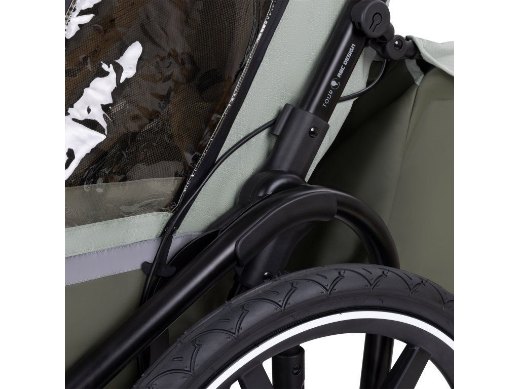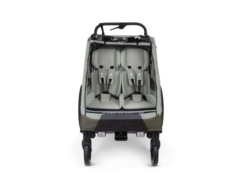 Bike Trailer Tour je flexibilní, bezpečný a pohodlný. Nastavitelná komfortní sedadla CozyCloud® nabízí měkké, ochranné polstrování a funkci sklápění. 5bodový systém pásů zajistí maximální bezpečnost. Kontrolovanou jízdu a dávkované brždění zajišťují ruční a kotoučové brzdy. To oceníte při rychlejší jízdě nebo na strmých cestách. Hladkou jízdu na všech typech povrchů zaručuje výkonné odpružení.