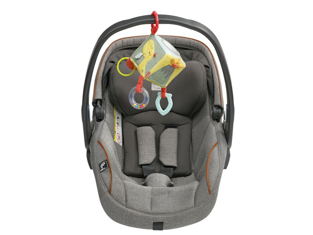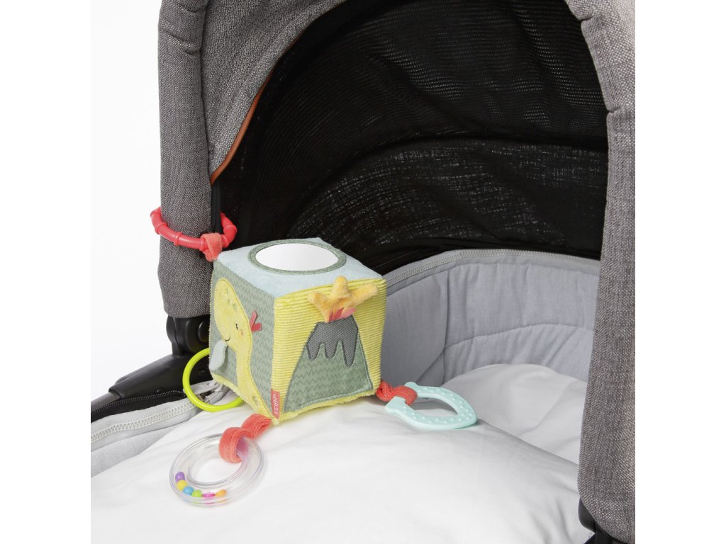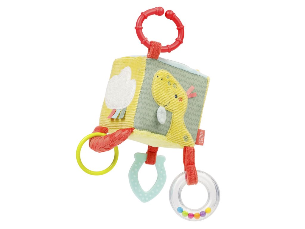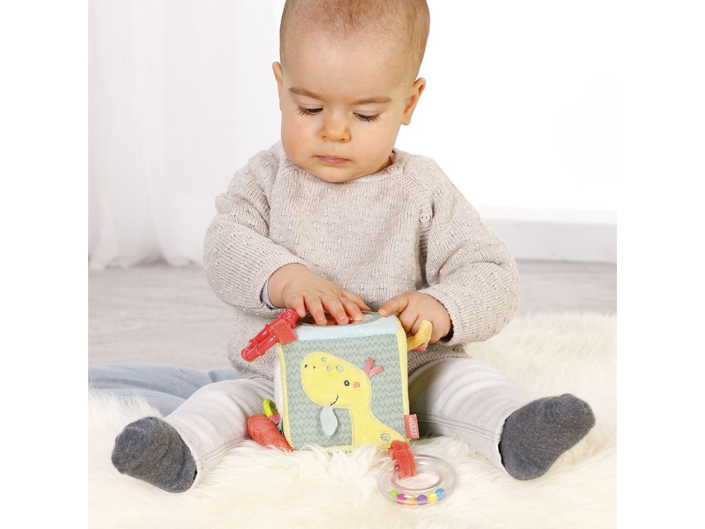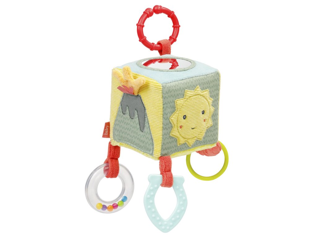 Kompaktný rozmer mäkkej plyšovej kocky umožňuje pohodlný úchop aj malými detskými ručičkami. Rozmanité farby a prívesky pozývajú k hre a preskúmavaniu. Bábätko sa môže vidieť v malom zrkadle, vydávať zvuky hrkálkou alebo zvončekom. Kocka rozvíja fantáziu a jemnú motoriku. Pomocou praktického krúžku je možné kocku ľahko pripevniť na kočík, autosedačku či na postieľku.