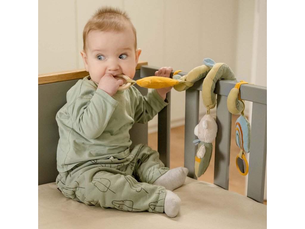 Medveď, mesiac aj dúha budú vášmu dieťatku nepostrádateľnými priateľmi či už v kočíku, autosedačke alebo v detskej postieľke. Na jednej špirále nájde váš malý dobrodruh všetky obľúbené hračky, ktoré zabavia a zároveň stimulujú jeho zmysly. Bezpečné zrkadlo, hryzátko, hrkálka, zvuky praskania a pískania stimulujú sluch a upútajú detskú pozornosť.