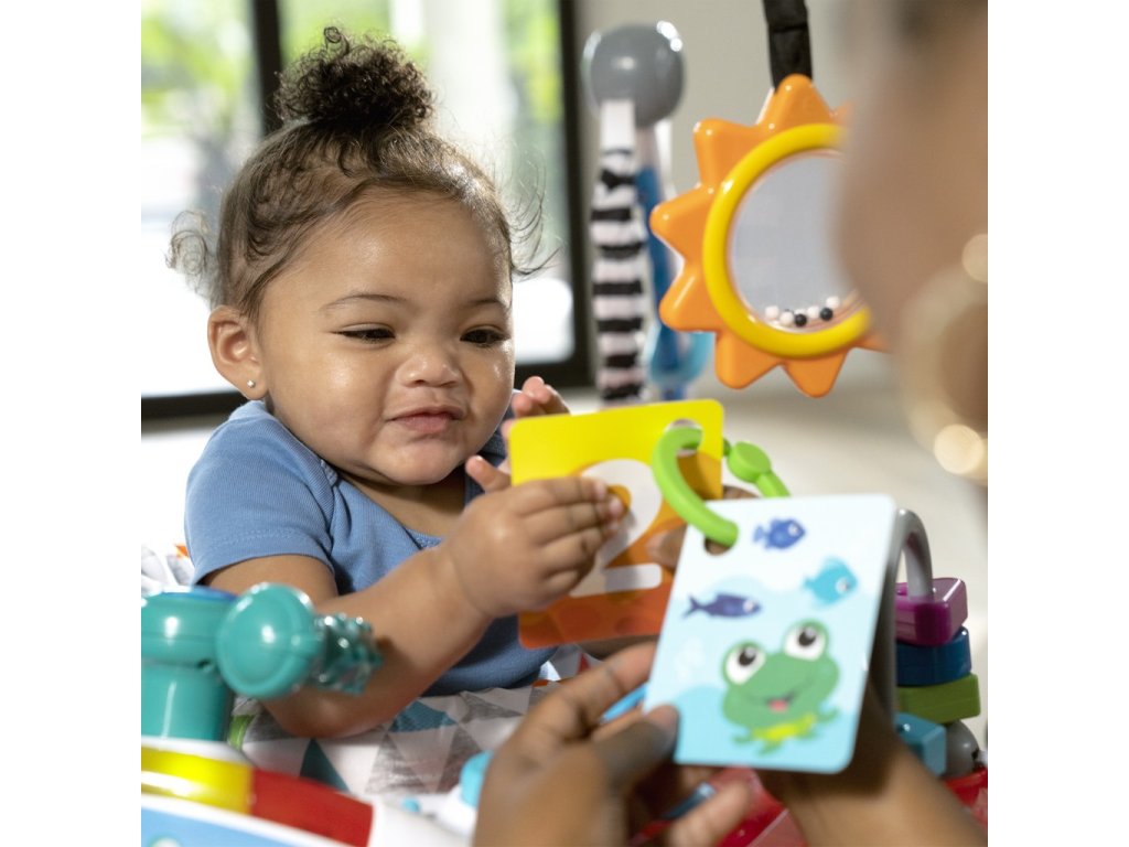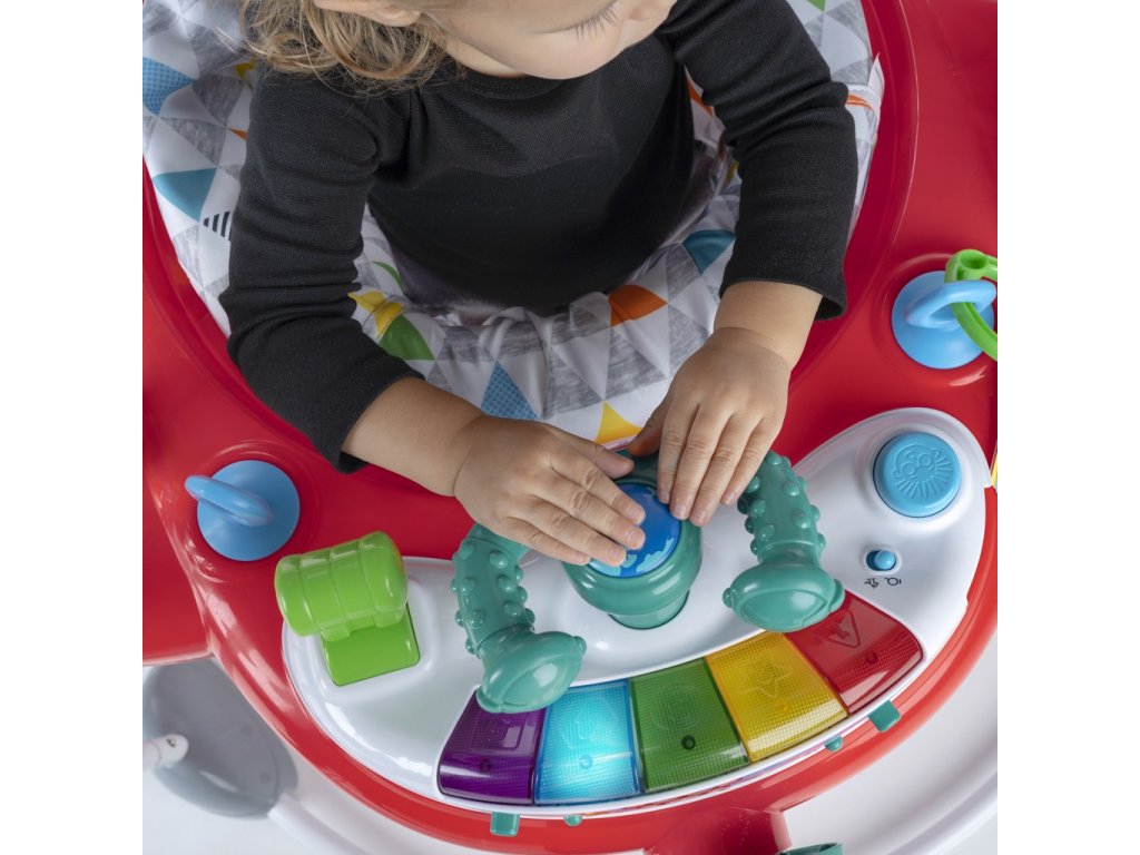 Dieťatko pri každom odraze aktivuje pesničky a svetlá, aby sa dostalo do zmyslovo stimulujúceho vzletu. Odnímateľný elektronický hrací pultík obsahuje 10 interaktívnych komponentov vrátane 7 tlačidiel, plynu a volantu, ktoré pomáhajú dieťaťu pilotovať. Dieťa sa môže učiť tvary, farby a čísla v 4 jazykoch - angličtine, španielčine, francúzštine a nemčine. 7 multisenzorických hračiek a aktivít zapája vývojové zručnosti, ako sú príčina a následok a zručnosť. Obľúbené postavičky Baby Einstein Ocean Explorers, ako Cal, Zen a Neptún, slúžia dieťaťu ako kopiloti.