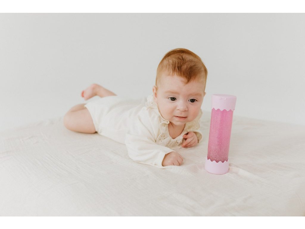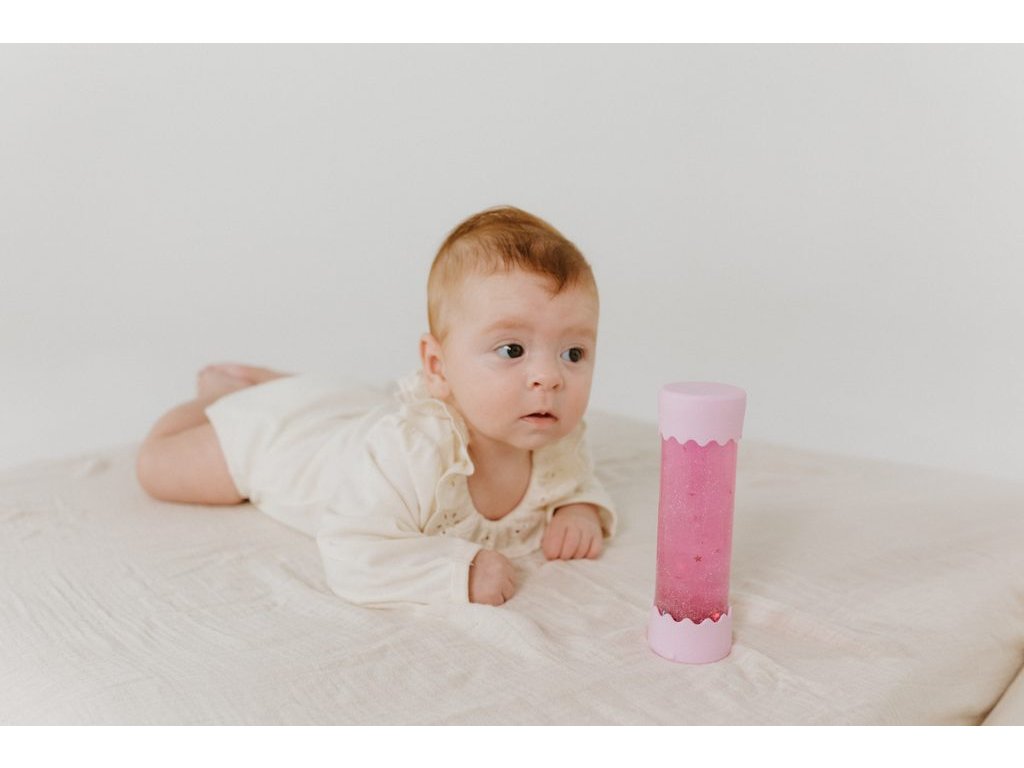 Děti fascinuje víření třpytek a flitrů uvnitř lahve. Sledování poletujících třpytek je perfektní aktivita pro čas strávený na bříšku. Později si miminka mohou lahvičku kutálet sem a tam po hrací podložce a rozvíjet tak pohybové dovednosti či koordinaci smyslů a pohybů ruka-oko.