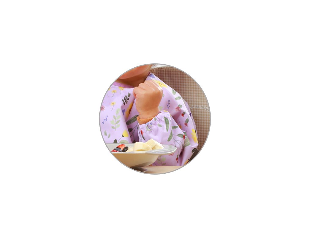 Podbradník s dlhým rukávom je šikovný pomocník, ktorý ochráni oblečenie Vášho bábätka. Počas jedenia zaisťuje prednú časť oblečenia aj rukávy, ktoré sa zvyknú zašpiniť. Vďaka pružným gumičkám dobre priľne k malým ručičkám bábätka. Podbradník s rukávmi má aj praktické vrecko na omrvinky, ktoré zachytáva zvyšky jedla. Zástera s rukávmi je vodeodolná a ľahko sa čistí, takže sa osvedčí, keď sa dieťatko učí jesť samo. Zapínanie podbradníka môžete ľubovoľne prispôsobiť veľkosti krku bábätka.