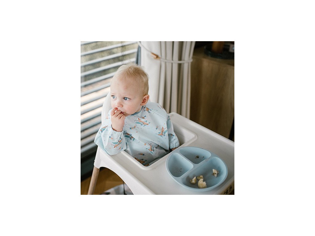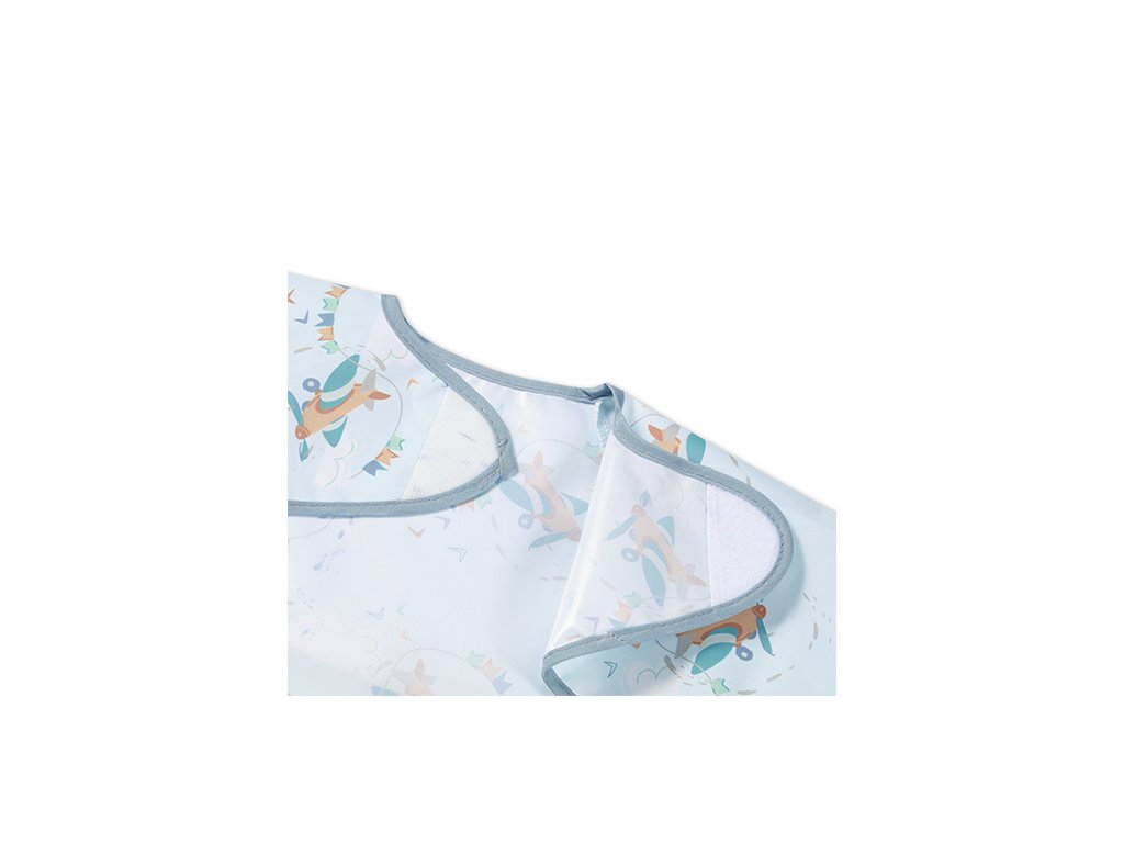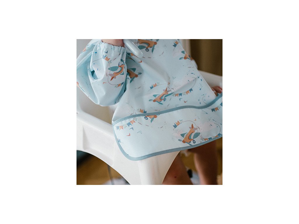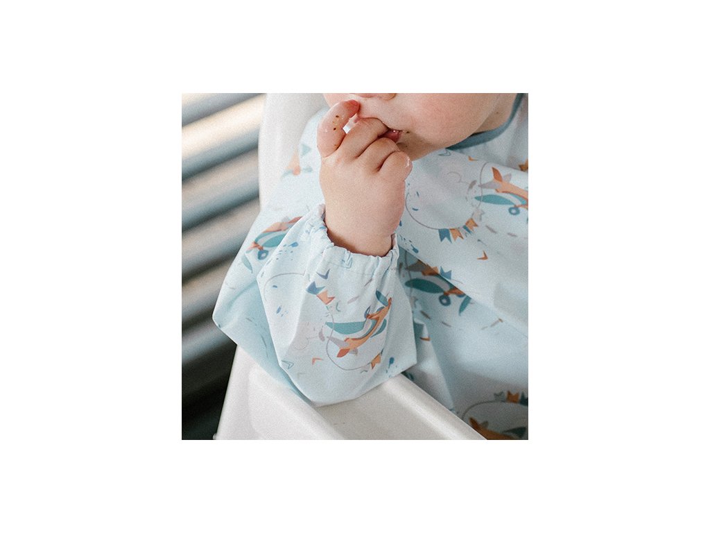 Podbradník s dlhým rukávom je šikovný pomocník, ktorý ochráni oblečenie Vášho bábätka. Počas jedenia zaisťuje prednú časť oblečenia aj rukávy, ktoré sa zvyknú zašpiniť. Vďaka pružným gumičkám dobre priľne k malým ručičkám bábätka. Podbradník s rukávmi má aj praktické vrecko na omrvinky, ktoré zachytáva zvyšky jedla. Zástera s rukávmi je vodeodolná a ľahko sa čistí, takže sa osvedčí, keď sa dieťatko učí jesť samo. Zapínanie podbradníka môžete ľubovoľne prispôsobiť veľkosti krku bábätka.