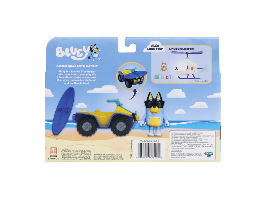 BLUEY Bandit s Plážovým Quadom - štvorkolkou je hrací set inšpirovaný obľúbeným animovaným seriálom "Bluey". Tento dobrodružný set umožňuje deťom pripojiť sa k Banditovi, jednej z postáv zo seriálu, pri objavovaní vzrušujúcich dobrodružstiev na pláži s jeho plážovým quadom.