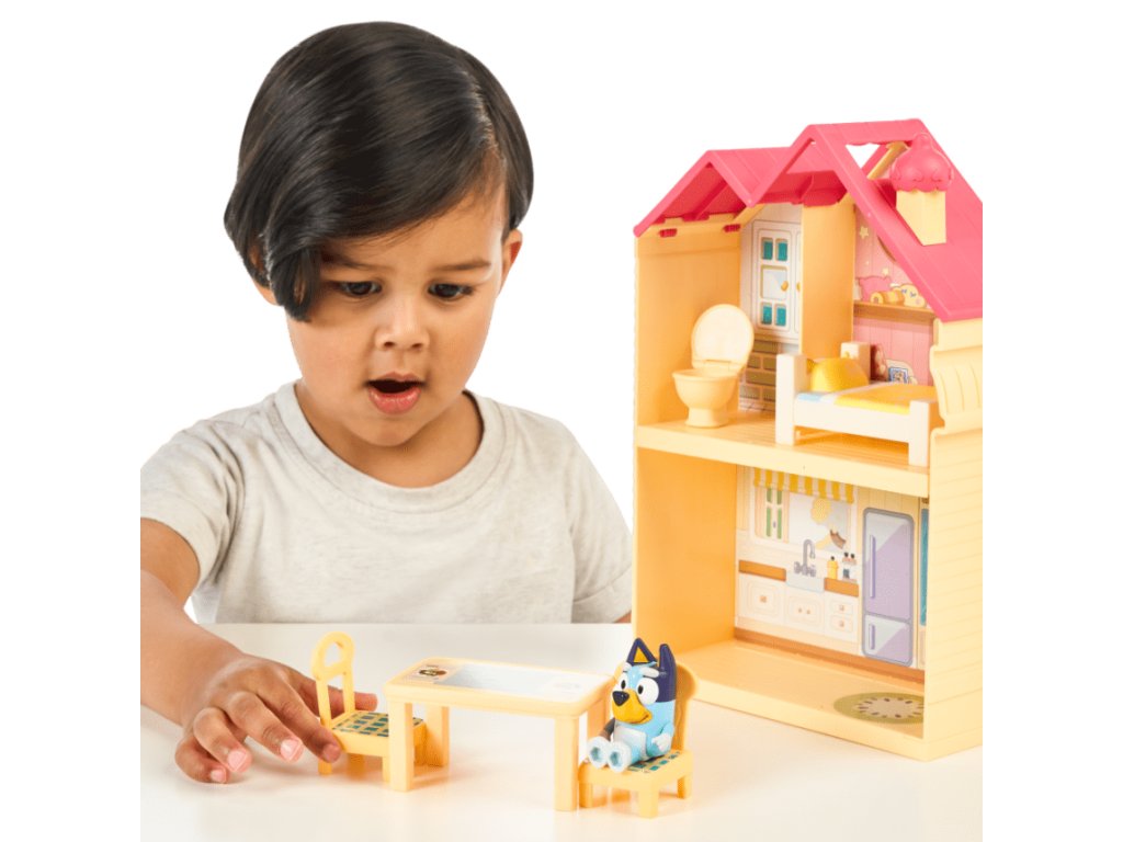 Deti môžu vytvárať vlastné príbehy a scenáre s postavičkami Bluey a jej rodiny v mini dome.