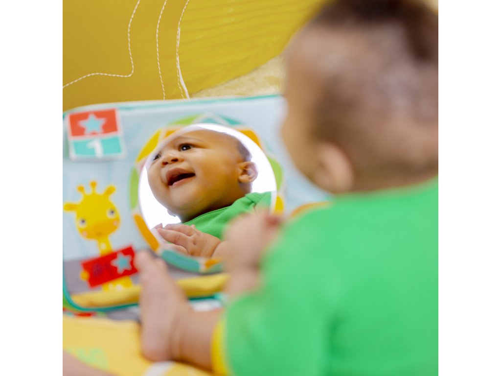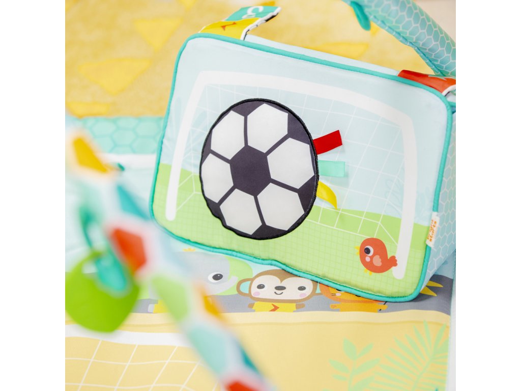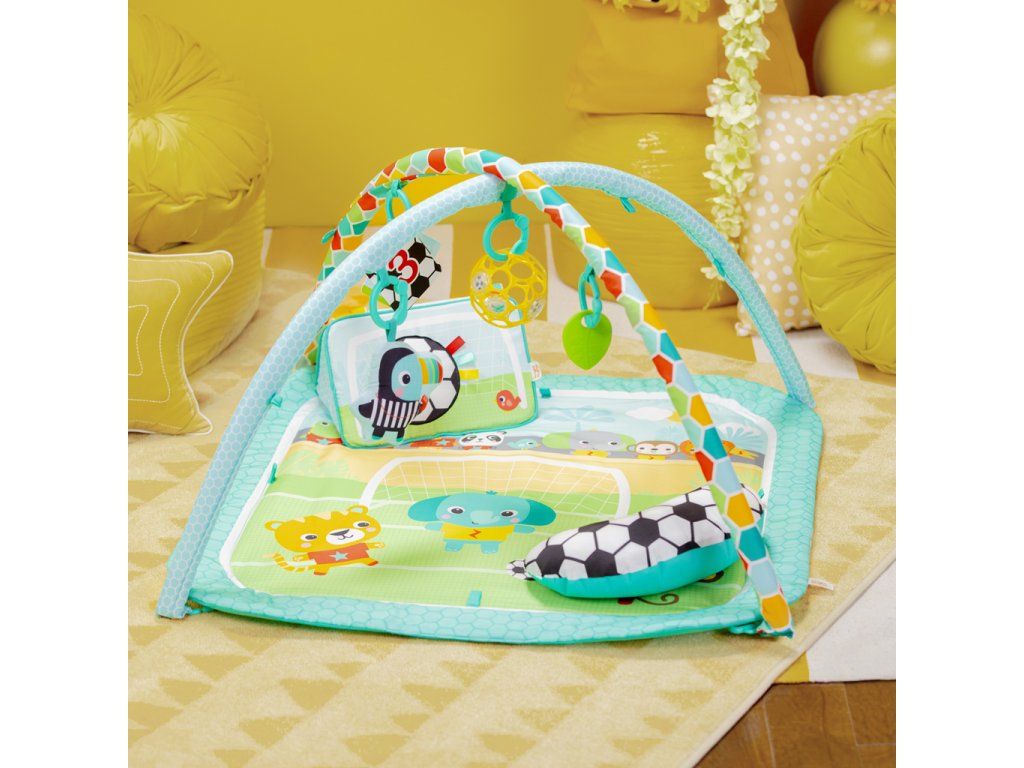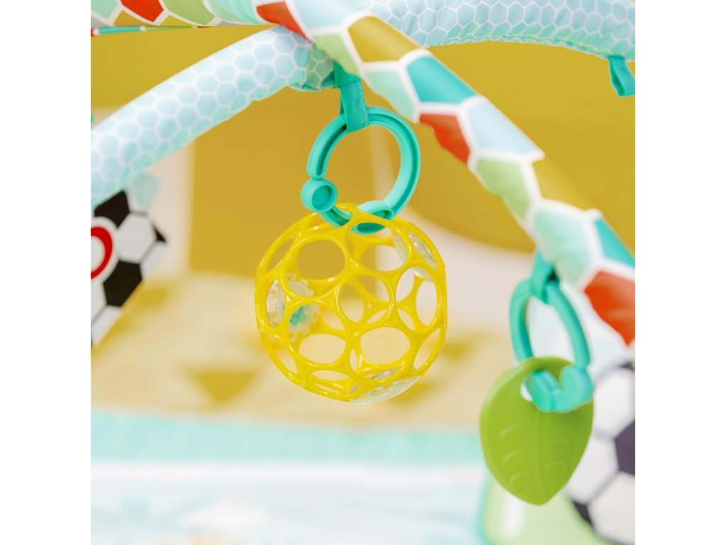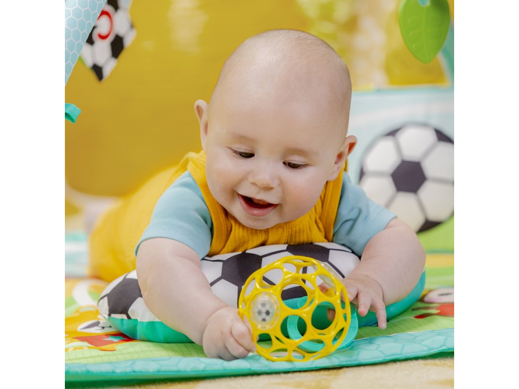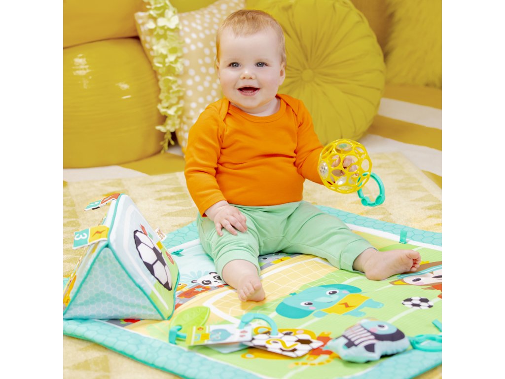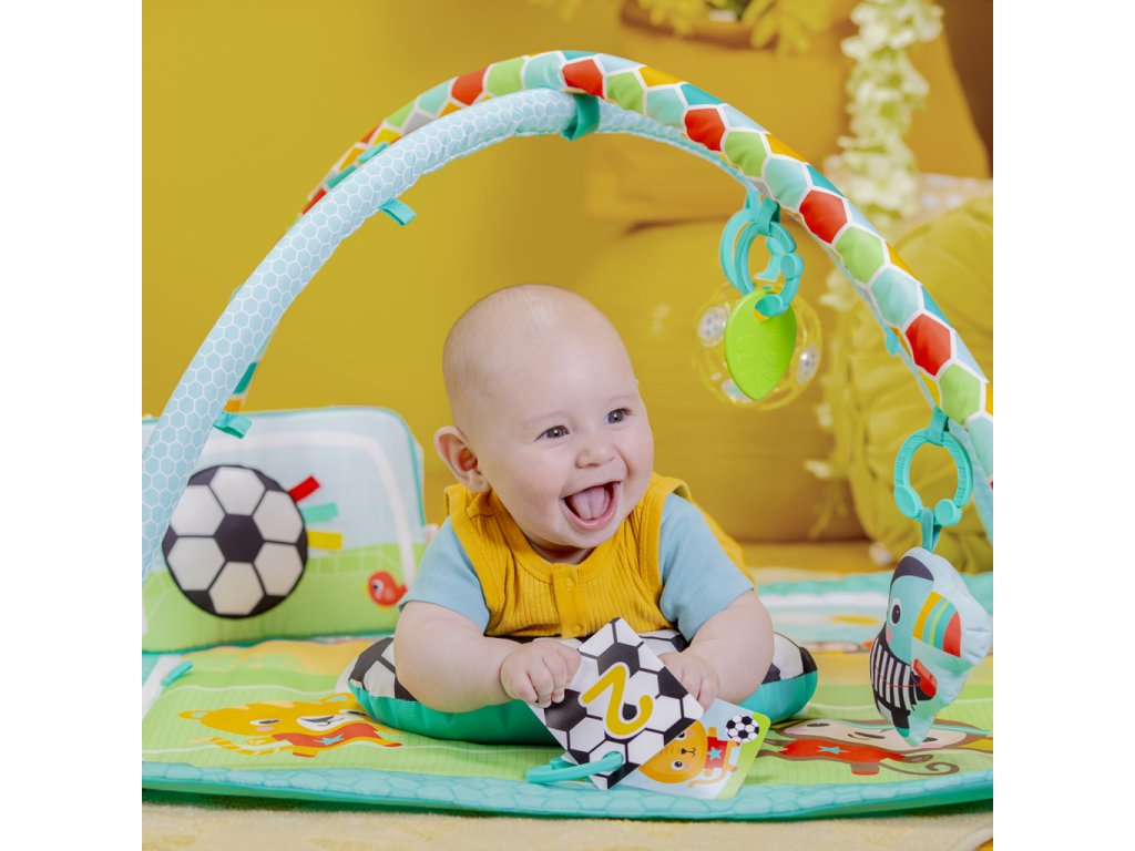 Priprav sa, kopni, skóruj. Prineste obľúbenú rodinnú technológiu Oball na futbalové ihrisko s dekou na hranie Bright Starts Oball Grip & Kick. Vďaka 4 spôsobom hrania si váš hviezdny hráč vychutná túto hernú posilňovňu. Hrazdičky a vývojové aktivity sa dajú ľahko preusporiadať tak, aby trávili čas na brušku, ležali a hrali sa, sedeli a hrali sa alebo sa bavili na cestách. Deka obsahuje ultra citlivú podložku so svetlami, melódiami a povzbudzujúcimi zvukmi, ktoré odmeňujú klopkanie alebo kopanie dieťatka. Udržujte svoju zvukovú stopu sviežu a zábavnú s viac ako 30 melódiami a zvukmi. Predstavte multizmyslovú hru so stuhami Taggies, zrkadielkom bezpečným pre detičky a vlajočkami „#1“, ktoré sú súčasťou podložky na kopanie.