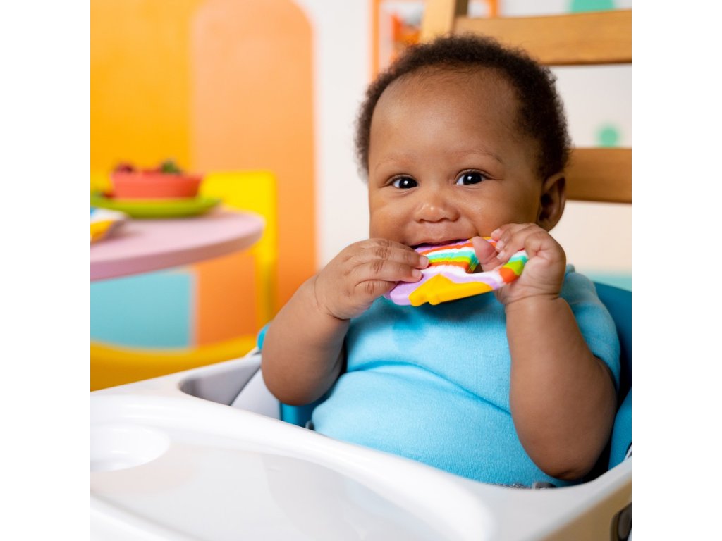 Podávajte vírivé kúzlo s upokojujúcim silikónovým hryzátkom Soft Serve od Bright Starts. Dieťatko si zamiluje pestré mramorované farby a zábavný tvar tohto hryzátka inšpirovaného zmrzlinou, zatiaľ čo rodičia si zamilujú netoxický silikónový materiál bez BPA. Silikón je mimoriadne mäkký na dotyk a mimoriadne odolný, čím vytvára bezpečnú a príjemnú hračku pre prerezávanie zúbkov. Toto univerzálne hryzátko v tvare zmrzlinového kornútka slúži na upokojenie boľavých ďasien dieťatka, pričom jeho povrch má rôznu textúru. Vyvýšené posýpky a hrebene vafľového kornútika... čo je sladšie ako toto?. Vďaka ľahko uchopiteľnému dizajnu sa dieťa môže držať rukoväte vafľového kužeľa a samo si upokojovať zúbky, kedykoľvek potrebuje útechu. Táto vírivá "sladká" pochúťka podporuje rozvoj jemnej motoriky, keď dieťa hryzie a uchopuje pestrofarebný dezert. Čerešničkou na torte je navyše jednoduché čistenie: stačí utrieť vlhkou handričkou a jemným mydlom. Nechajte uschnúť na vzduchu. Neponárajte do vody. Ideálne pre deti od 3 mesiacov.