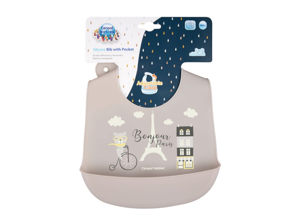 CANPOL BABIES Podbradník silikónový s vreckom Bonjour Paris béžový