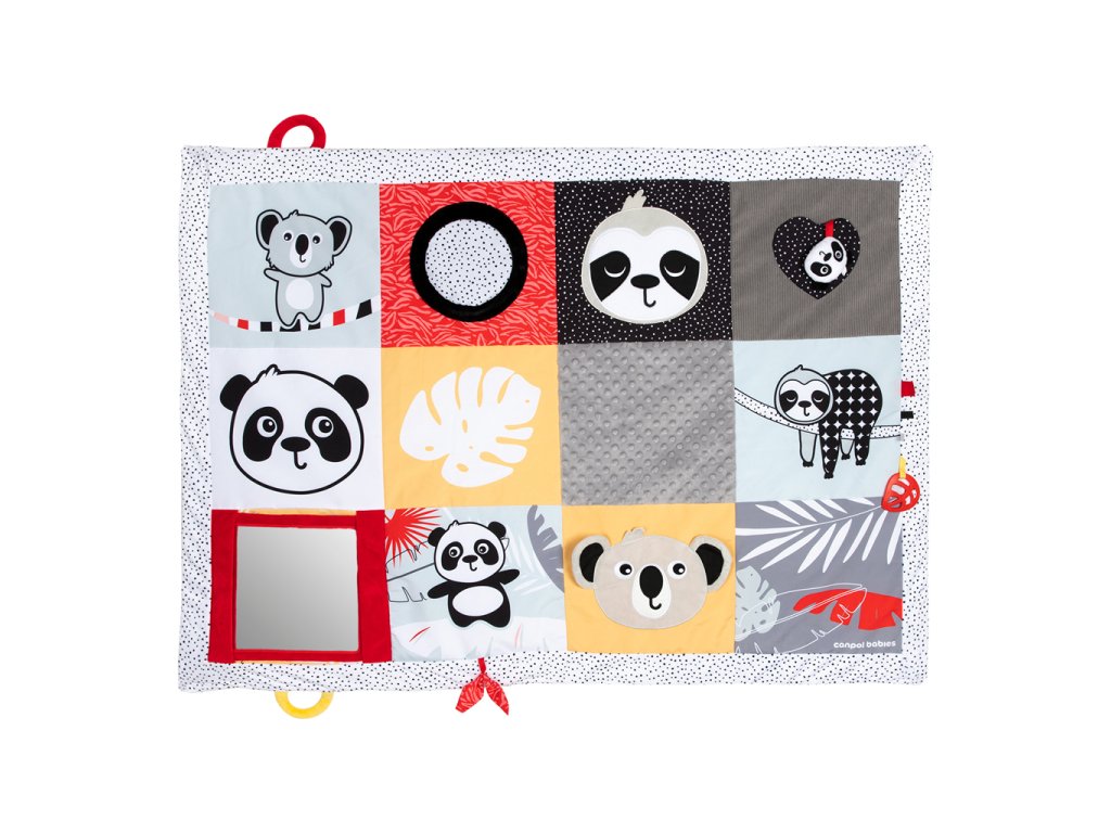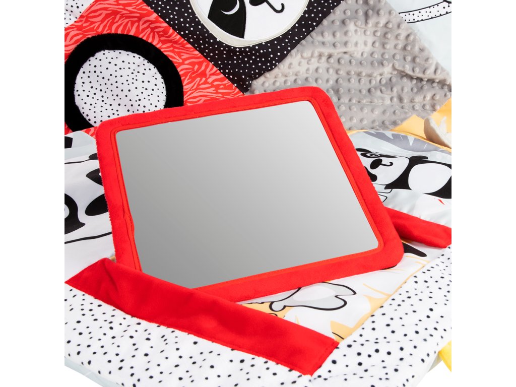 Veľké zrkadlo povzbudzuje a predlžuje lezenie na brušku, počas ktorého môže bábätko zakaždým preskúmať rôzne časti podložky. Veľké množstvo zmyslových prvkov zapája detské zmysly: zrak, sluch a hmat. Rôzne textúry materiálov, kontrastné farby a vzory a jemné zvuky sú skvelou zábavou pre rozvíjajúce sa zmysly vášho bábätka od prvých okamihov života. Senzorická náučná podložka Canpol babies pomôže zaistiť správnu motoriku každého dieťaťa. Podložku je možné prať v práčke.