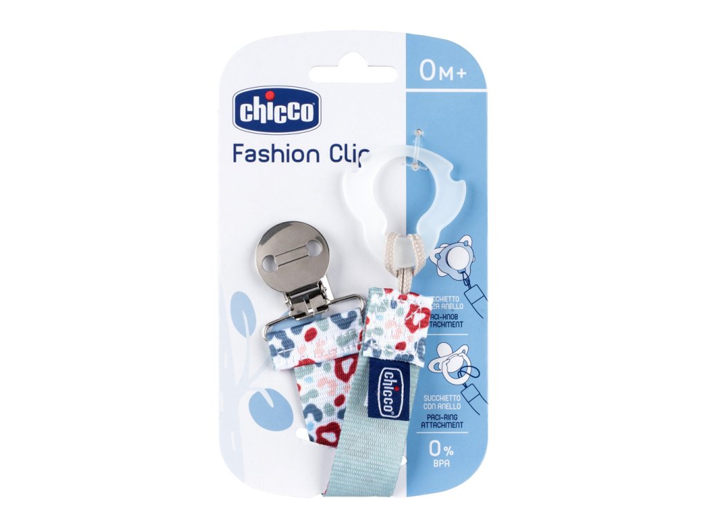 Univerzálny a módny klip Chicco Fashion je vhodný pre väčšinu cumlíkov. Vďaka nemu bude mať dieťatko aj vy svoj obľúbený cumlík vždy pri sebe a ostane tak dlhšie čistý. Potlač je obojstranná. Inovatívny dizajn umožňuje jednoduché pripevnenie na cumlíky. Na cumlíky s krúžkom ho jednoducho pripevníte pomocou šnúrky a cumlíky bez krúžka sa prichytia vďaka mäkkému krúžku na konci klipu.