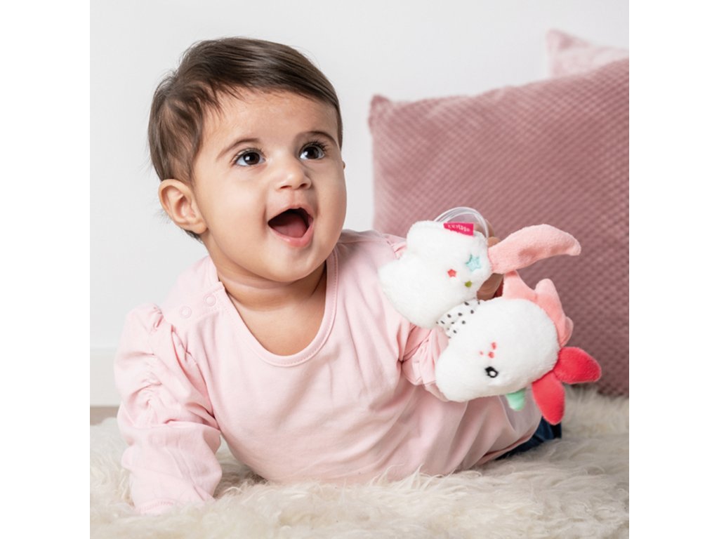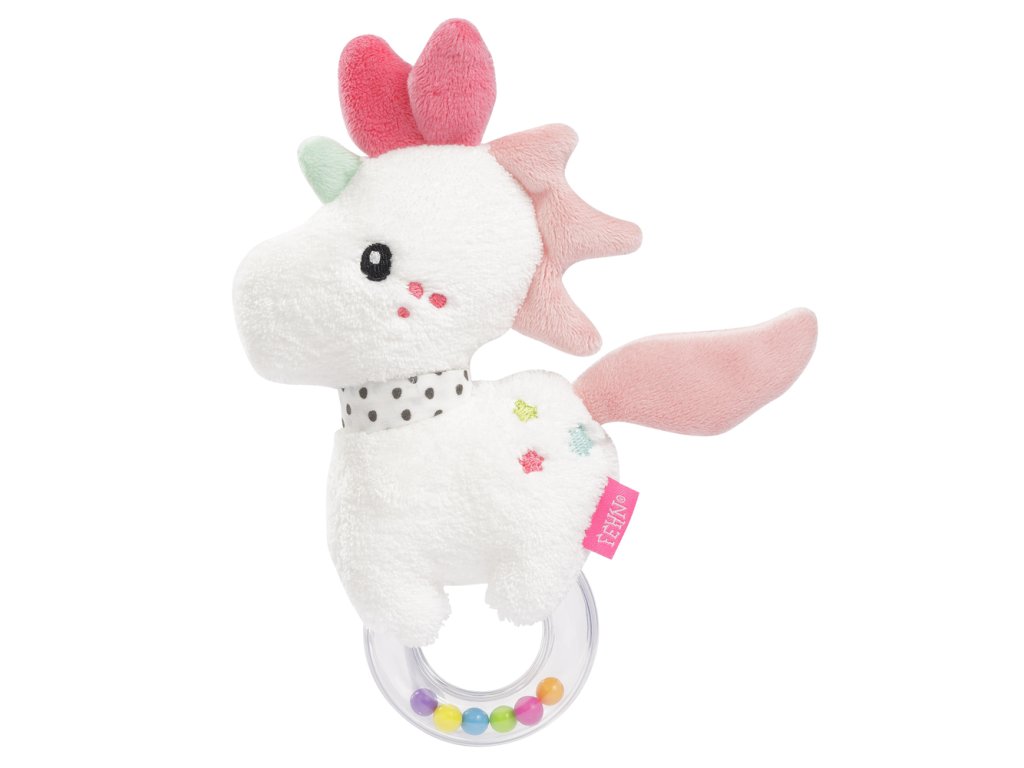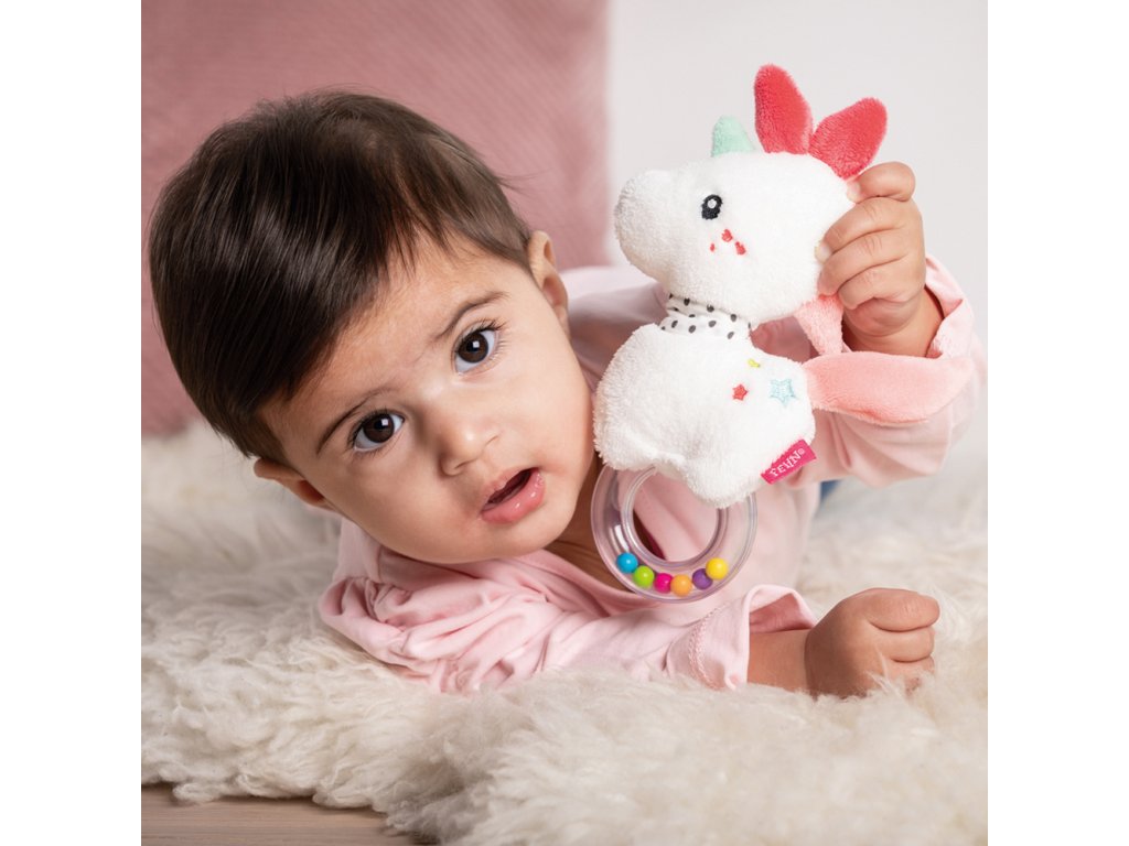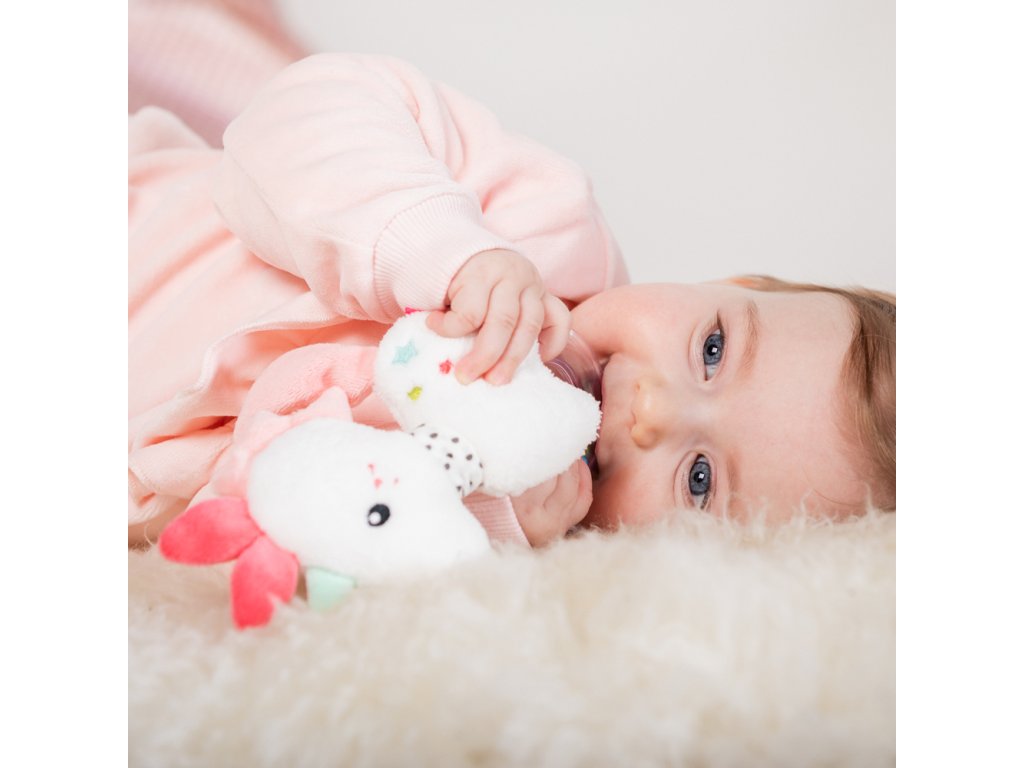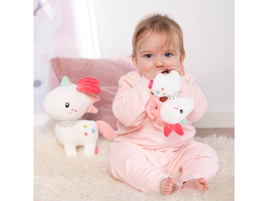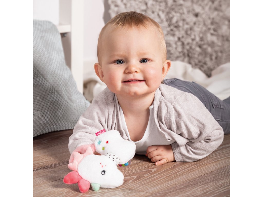 Jednorožec hravo trénuje sluch dieťaťa, dotýkanie a jemnú motoriku, preto je ideálnym darčekom k narodeniu, krstu či narodeninám.