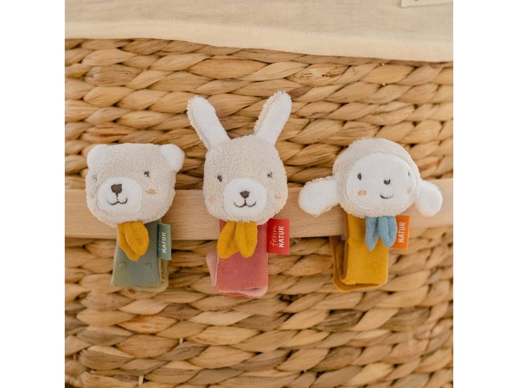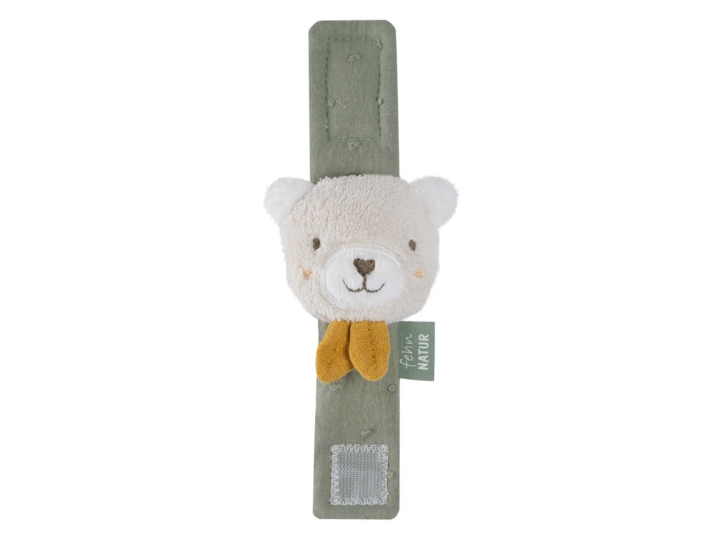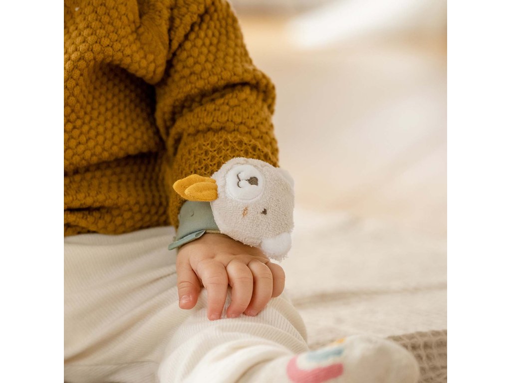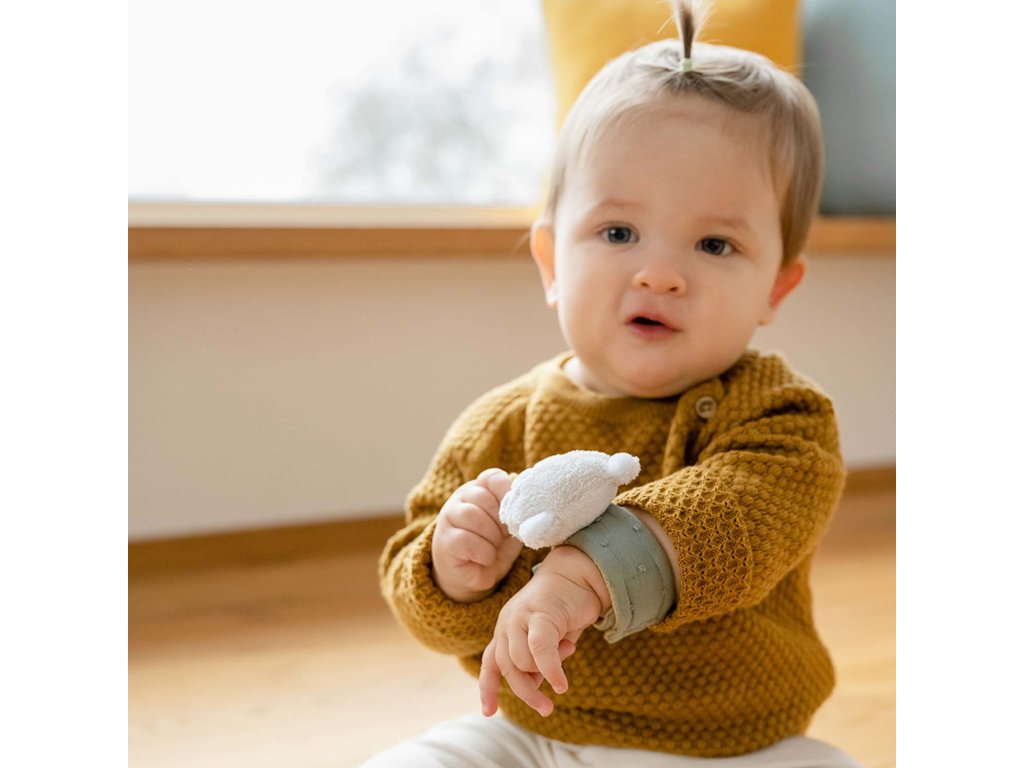 Ľahko sa nasadzuje na ručičku, pri pohybe dieťatka – trasenie ručičkami vydáva fascinujúce zvuky, ktoré malé deti milujú. Hrkajúci náramok hravou formou podporuje sluch, úchop a hmat bábätka aj jemnú motoriku.