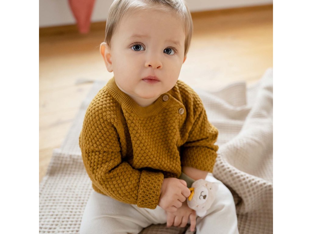 Ľahko sa nasadzuje na ručičku, pri pohybe dieťatka – trasenie ručičkami vydáva fascinujúce zvuky, ktoré malé deti milujú. Hrkajúci náramok hravou formou podporuje sluch, úchop a hmat bábätka aj jemnú motoriku.