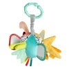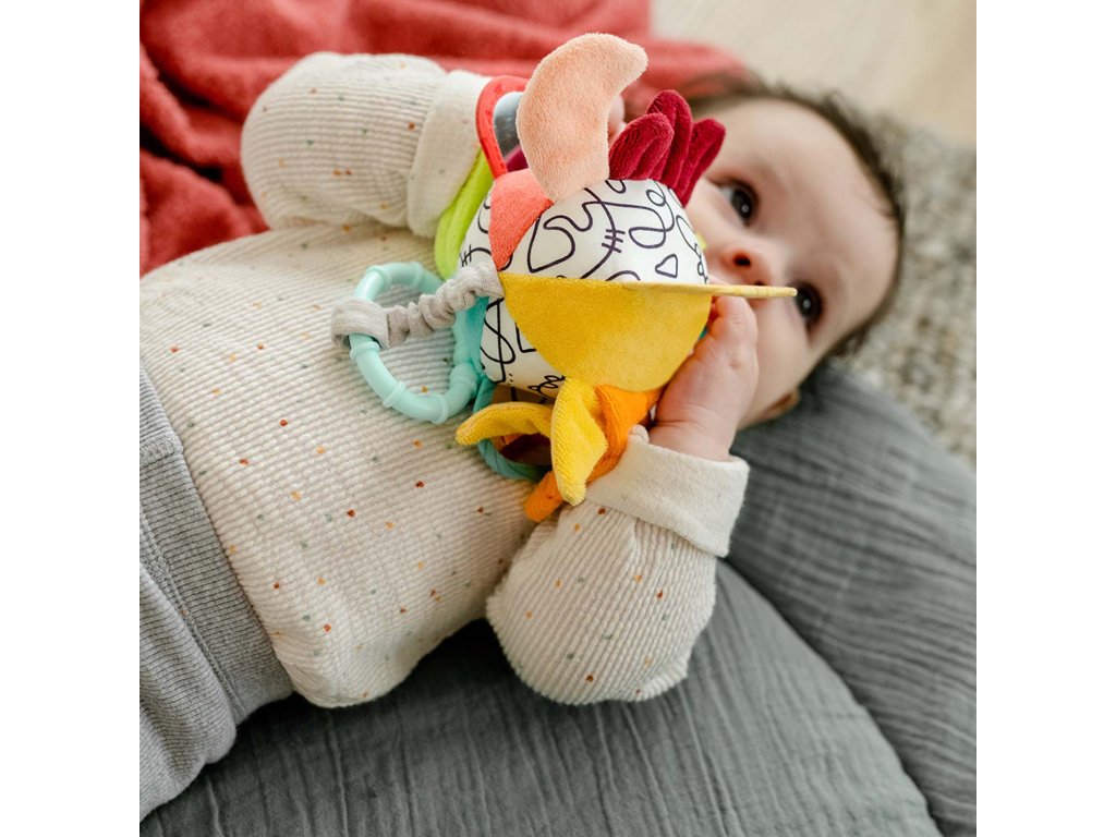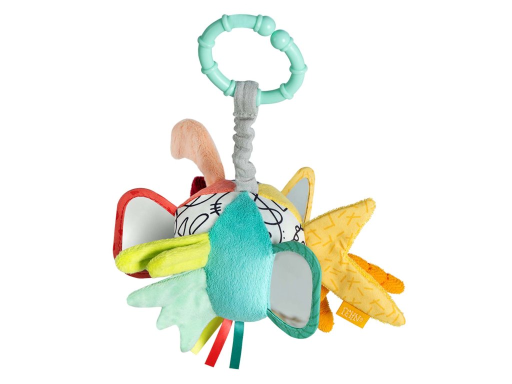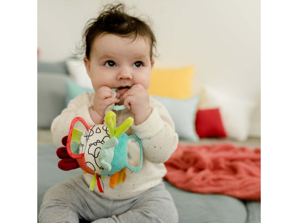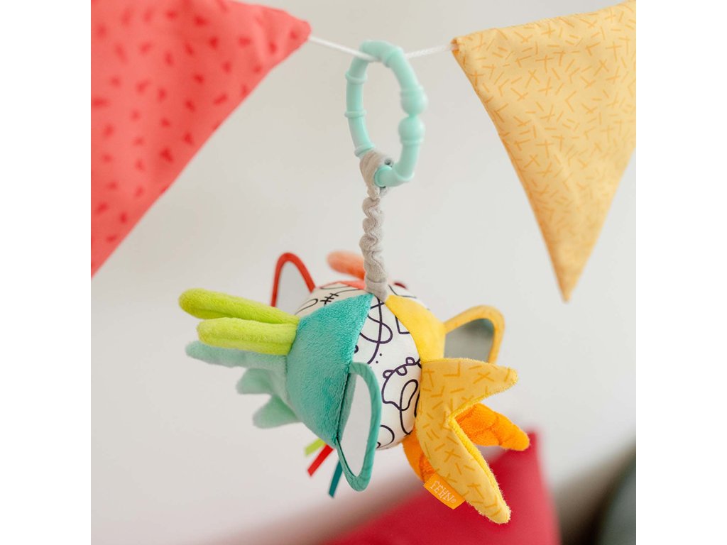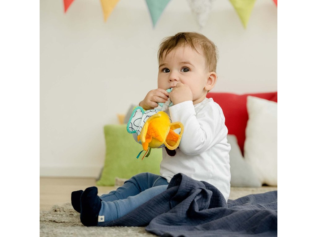 Farebná, vysoko kontrastná látková lopta hravo podporuje rozvoj zmyslov: podporuje zmysel pre zrak, sluch, obratnosť, koordináciu rúk a očí, motoriku a logické myslenie. Deti si túto hračku rýchlo obľúbia a vďaka praktickej veľkosti a upevňovaciemu krúžku si ju môžu vziať všade – či už doma v postieľke alebo na cestách, v autosedačke alebo v kočíku.