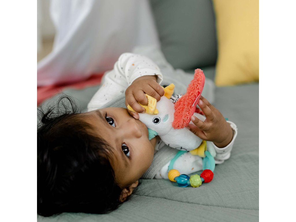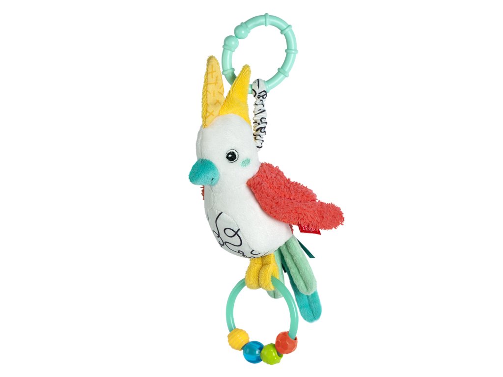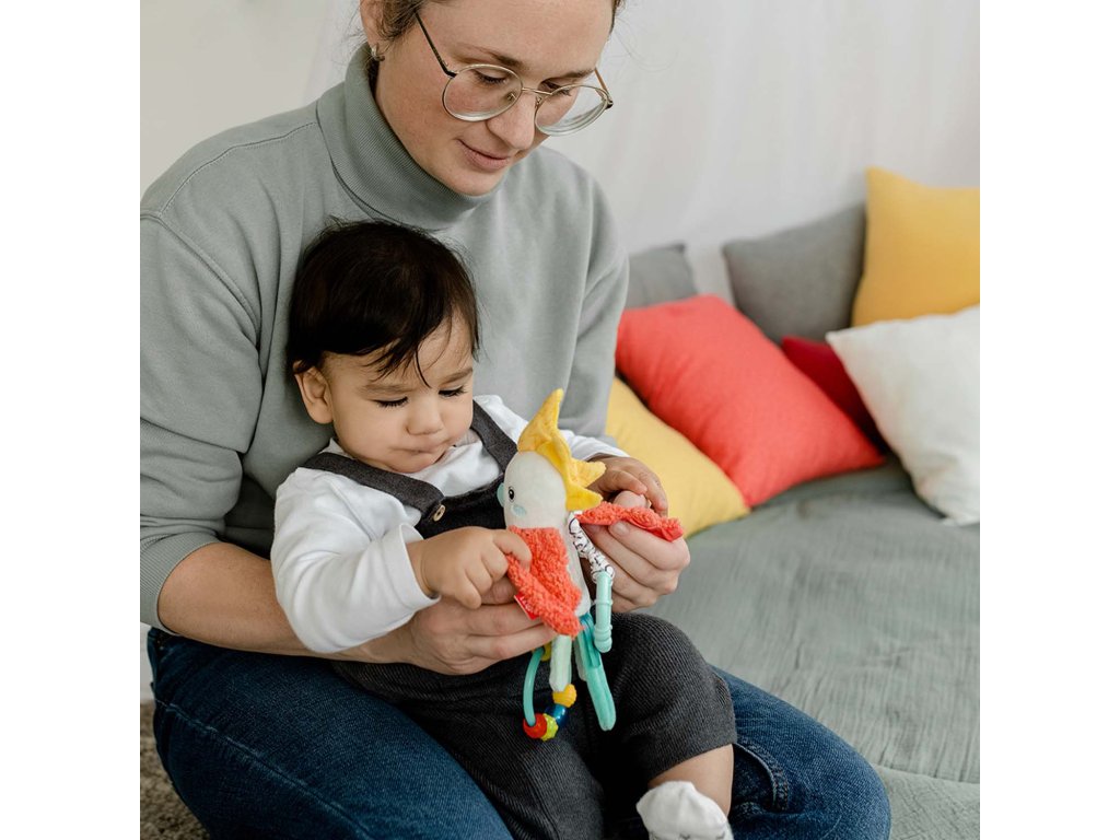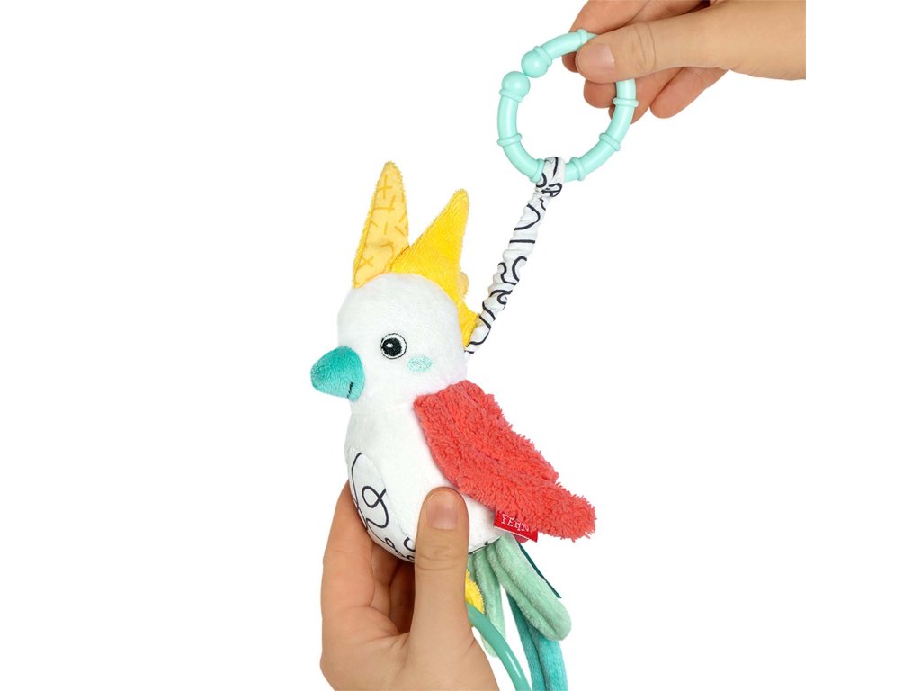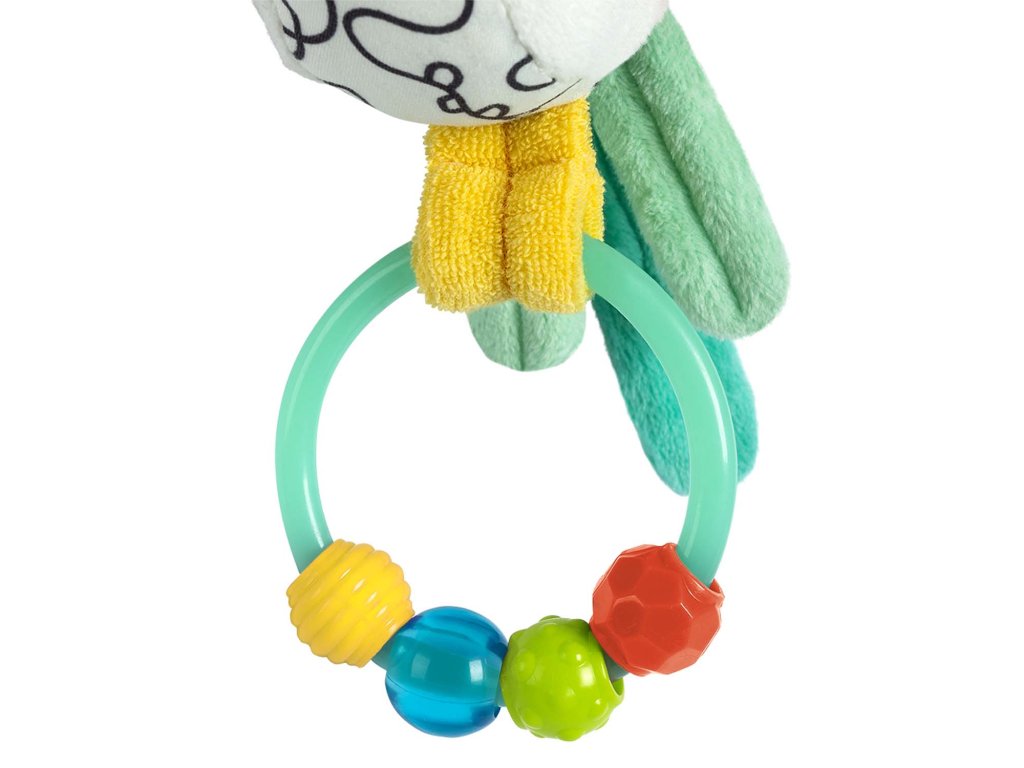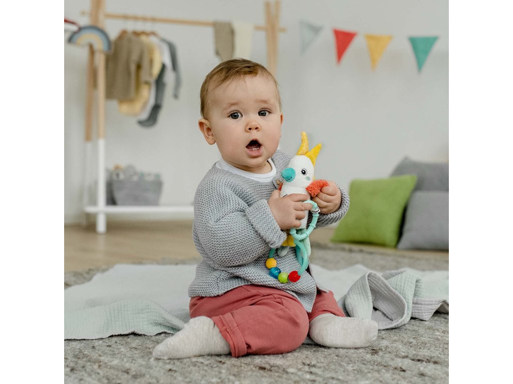 Plyšová hrkálka s množstvom aktivity prvkov ako je úchopový krúžok, hrkálka, pískací mechanizmus a škrípavý papier. Hračka na uchopenie hravo podporuje sluch dieťaťa, zmysel pre zrak, hmat, zdravé uchopenie a logické myslenie – ideálny ako darček pre chlapcov a dievčatá k narodeniu, narodeninám či krstu.