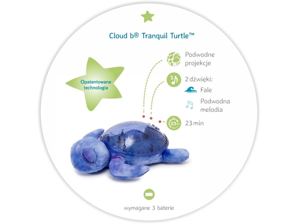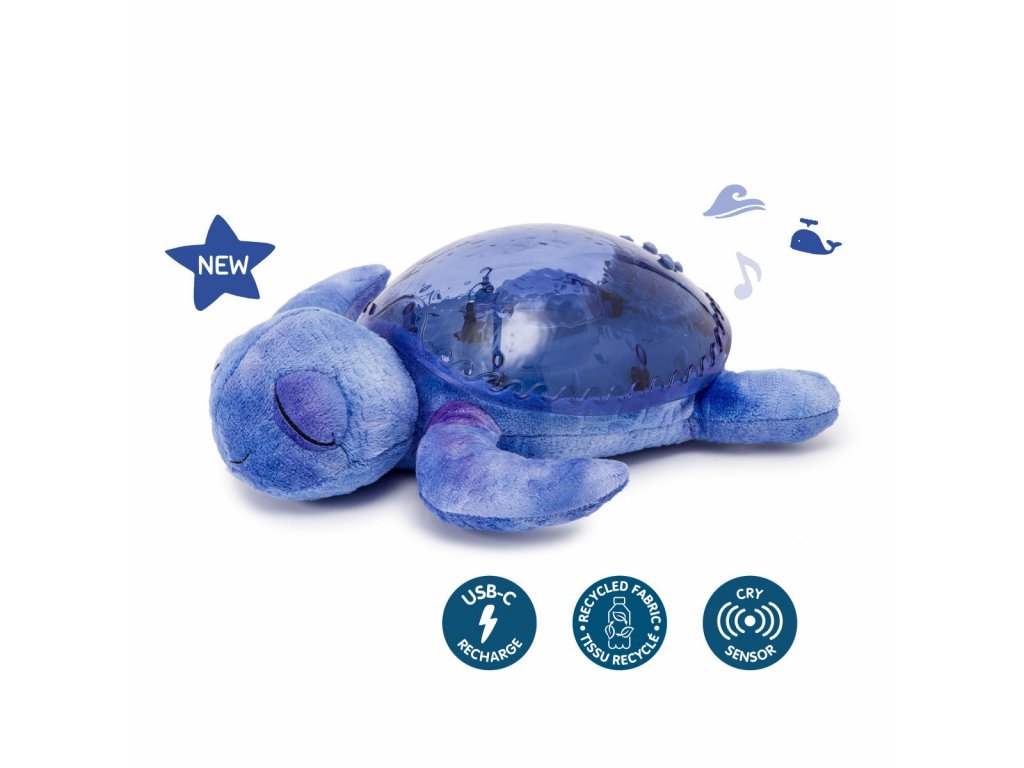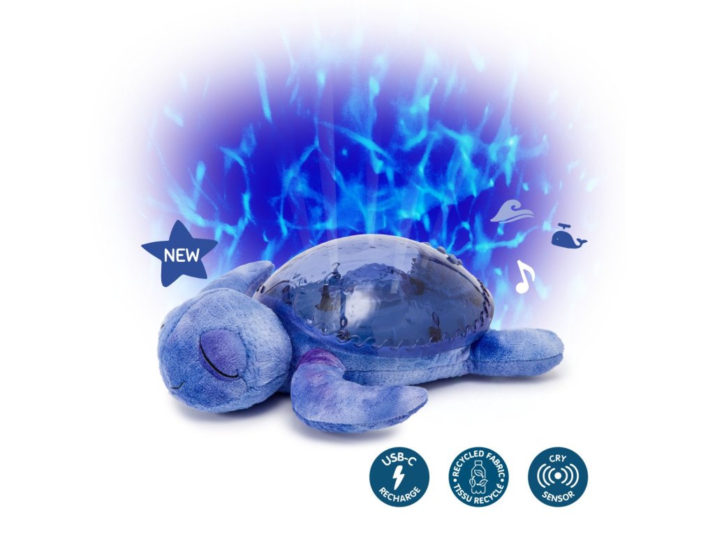 Cloud b® Tranquil Turtle™ je nová ekologická verzia ikonického nočného svetielka v podobe korytnačky, ktorá pomáha deťom upokojiť sa a zaspávať. Táto rozkošná korytnačka žiari jemným svetlom a premieta pohybujúce sa vlny oceánu na strop a steny miestnosti. Nová verzia je vyrobená z recyklovaných materiálov a je vyrobená tak, aby minimalizovala svoju uhlíkovú stopu.