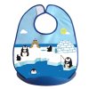 Podbradník s korýtkom dokonale chráni odev dieťaťa. Motív tučniakov. Tyrkysový úplet s podšívkou potiahnutý priehľadným potlačeným plastom.