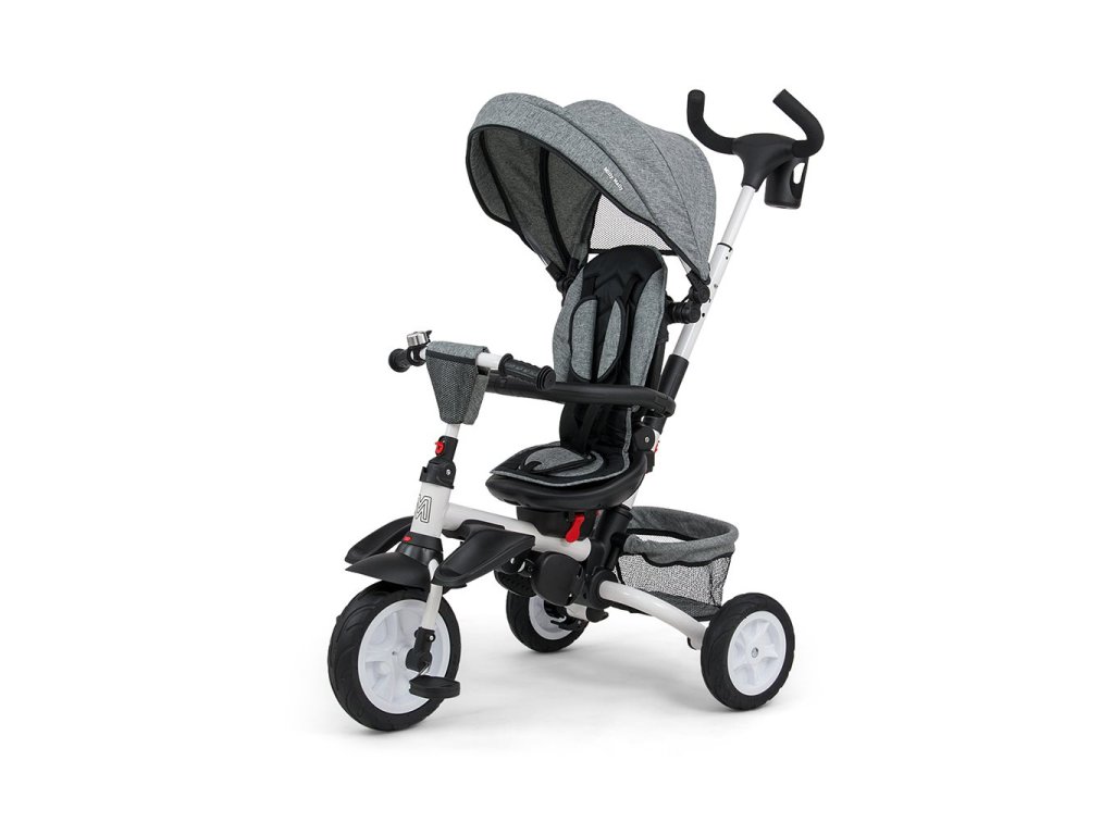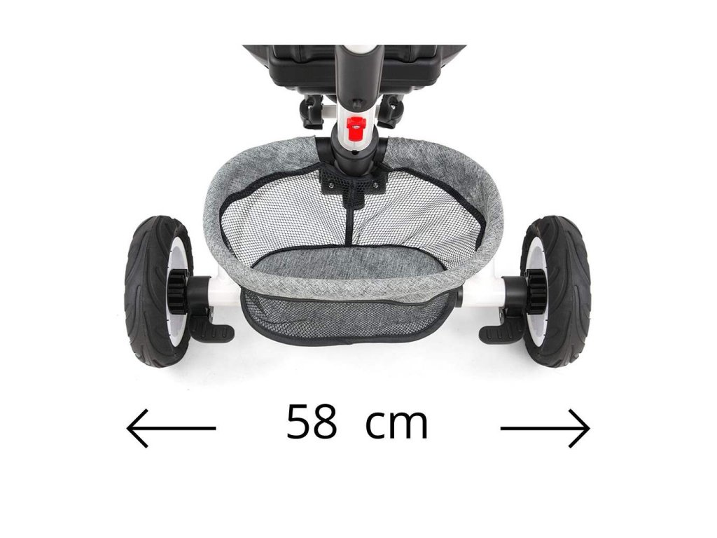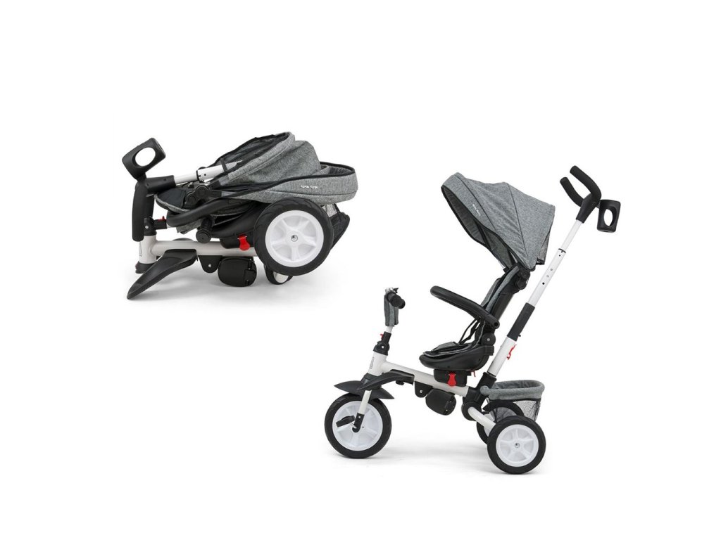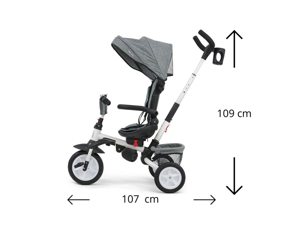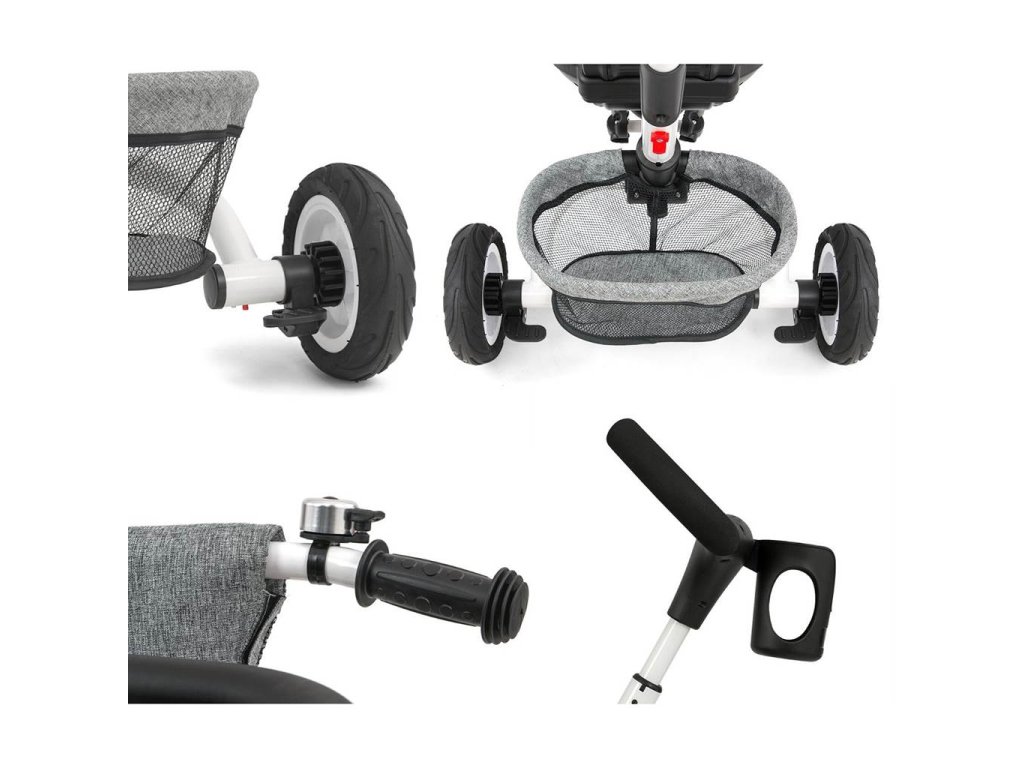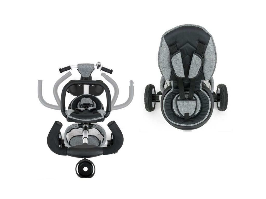 Je vyrobená z kvalitných a odolných materiálov. Má modernú konštrukciu, pohodlné a ergonomicky tvarované sedadlo, ktoré je otočné o 360 stupňov, čo umožní dieťaťu cestovať v smere alebo proti smeru jazdy. O pohodlie a bezpečie počas jazdy sa starjú bariérky, trojbodové bezpečnostné pásy, pohodlné stúpačky alebo gumové kolesá, ktoré skvele absorbujú narázy a poskytujú dobrú priľnavosť. Trojkolku môže ovládať ako dieťa, tak aj rodič pomocou nastaviteľnej rukoväte pre tlačenie. Po odobratí vodiacej tyče, sklápacej striešky, ktorá chráni pred slnkom alebo ostatných komponentov bude slúžiť ako trojkolka. Trojkolku je možné používať aj ako alternatívu golfového kočíka. Pre uloženie hračiek alebo potrieb pre dieťa je tu praktický úložný košík.