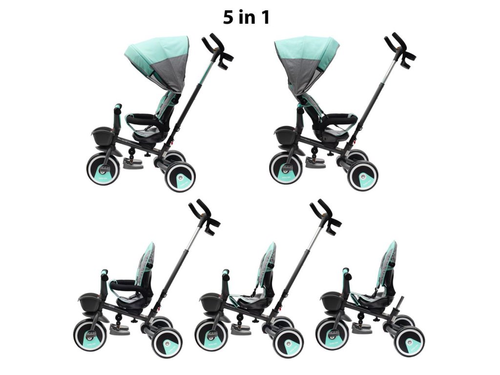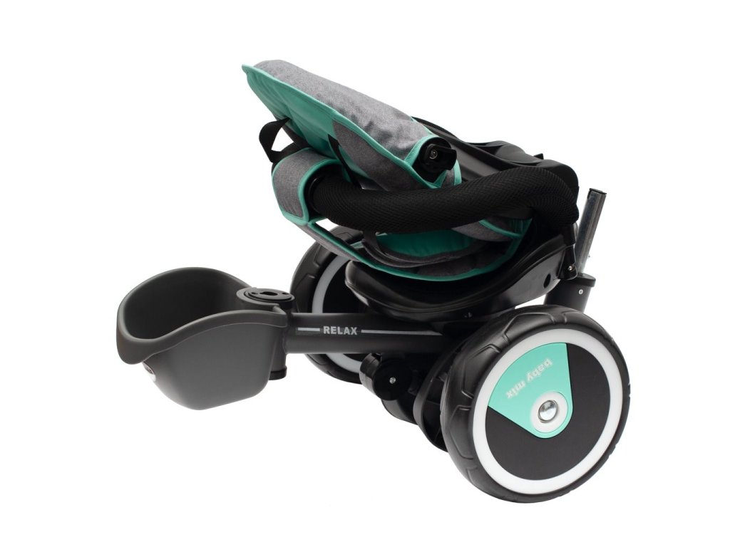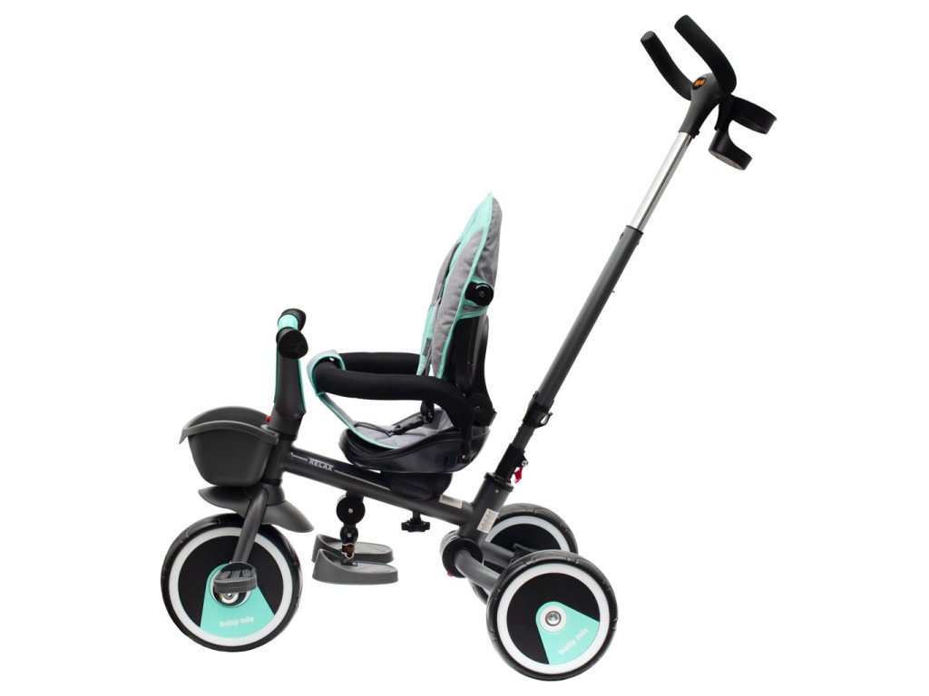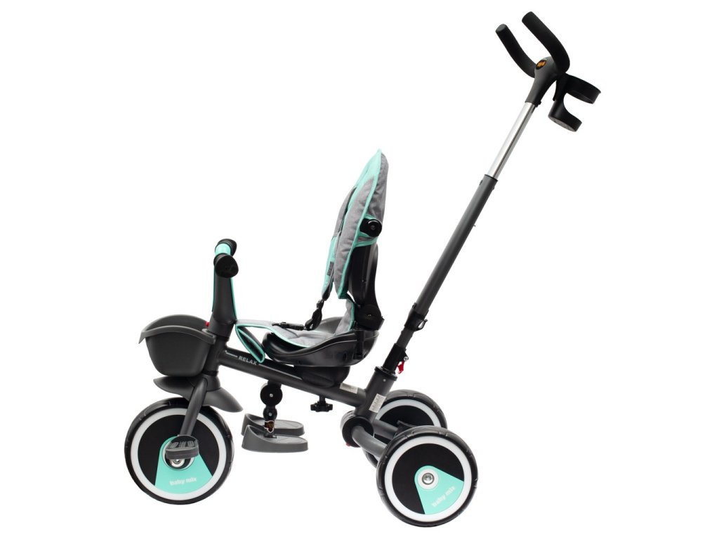 Detská šliapacia trojkolka Baby Mix 5v1 RELAX je multifunkčný dopravný prostriedok, je typickým príkladom produktov GROW UP - rastie zároveň s dieťaťom. Trojkolku môže ovládať ako dieťa, tak aj rodič pomocou nastaviteľnej vodiacej tyče. Po odobratí vodiacej tyče, sklápacej striešky, ktorá chráni pred slnkom alebo ostatných komponentov bude slúžiť ako trojkolka. Má moderný konštrukciu, pohodlné a ergonomicky tvarované sedadlo, ktoré je posuvné a otočné o 360 stupňov, čo umožní dieťaťu cestovať v smere alebo proti smeru jazdy. Je vyrobená z kvalitných a odolných materiálov a skladacia konštrukcia umožňuje bezproblémovú prepravu trojkolky napríklad v kufri auta. Jej skladanie je veľmi jednoduché, intuitívne a nevyžaduje žiadne náradie. O pohodlie a bezpečie počas jazdy sa stará odnímateľná hrazda, päťbodové bezpečnostné pásy, pohodlné stúpačky alebo kolesá vyrobené z tvrdenej peny EVA, ktoré skvele absorbujú nárazy, poskytujú perfektnú priľnavosť a nevyžadujú hustenie. Pre uloženie hračiek alebo potrieb pre dieťa je tu praktický úložný košík.
