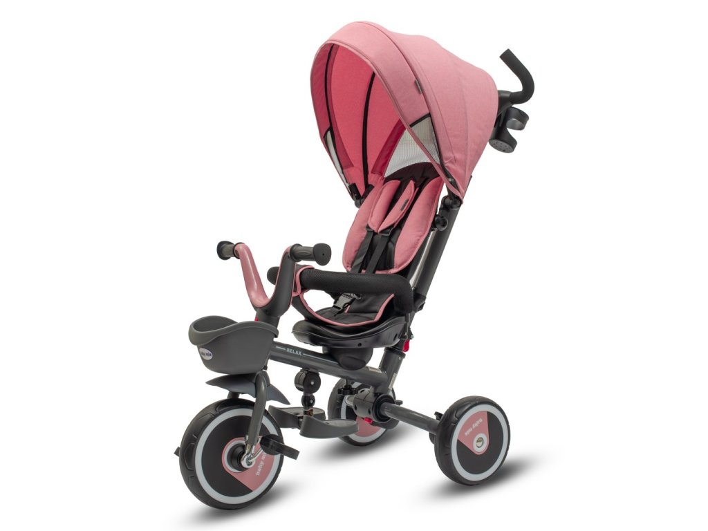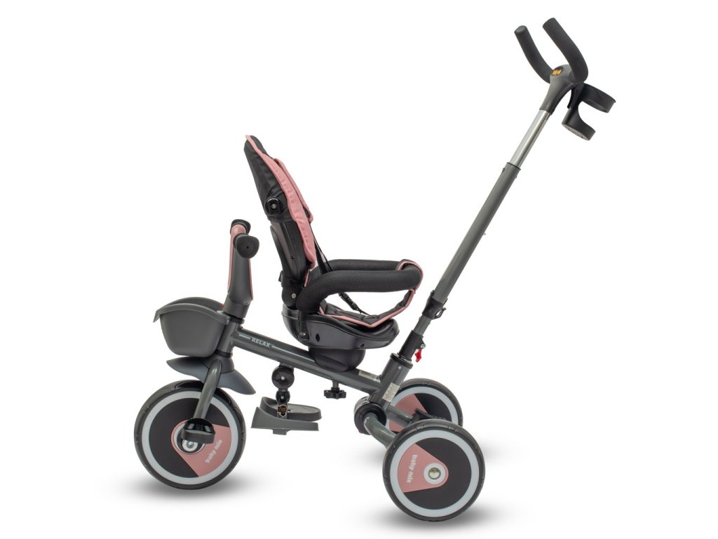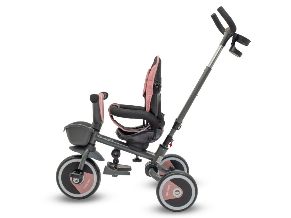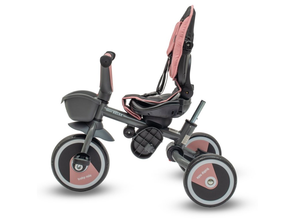 Dětská šlapací tříkolka Baby Mix 5v1 RELAX 365 je multifunkční dopravní prostředek a je typickým příkladem produktů GROW UP – roste zároveň s dítětem. Tříkolku může ovládat jak dítě, tak i rodič pomocí nastavitelné vodicí tyče. Po odebrání vodicí tyče, sklápěcí stříšky, která chrání před sluncem, nebo ostatních komponent bude sloužit jako tříkolka. Má moderní konstrukci, pohodlné a ergonomicky tvarované sedadlo, které je posuvné a otočné o 360 stupňů, což umožní dítěti cestovat ve směru nebo proti směru jízdy. Je vyrobena z kvalitních a odolných materiálů a skládací konstrukce umožňuje bezproblémovou přepravu tříkolky například v kufru auta. Její skládání je velmi jednoduché, intuitivní a nevyžaduje žádné nářadí.