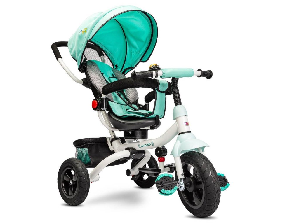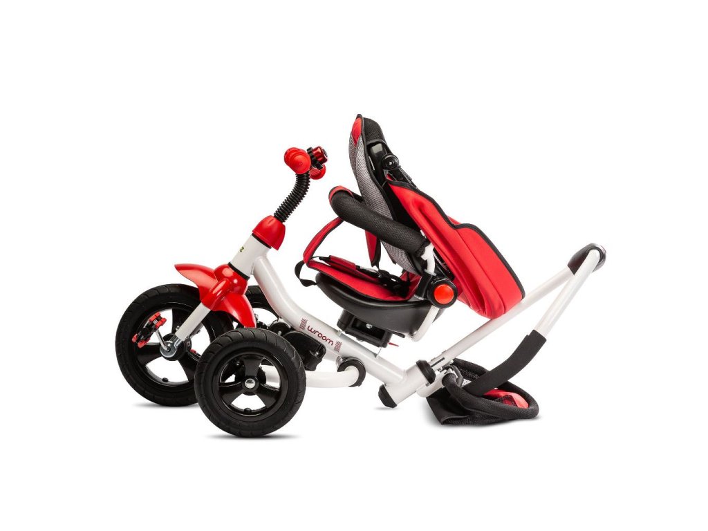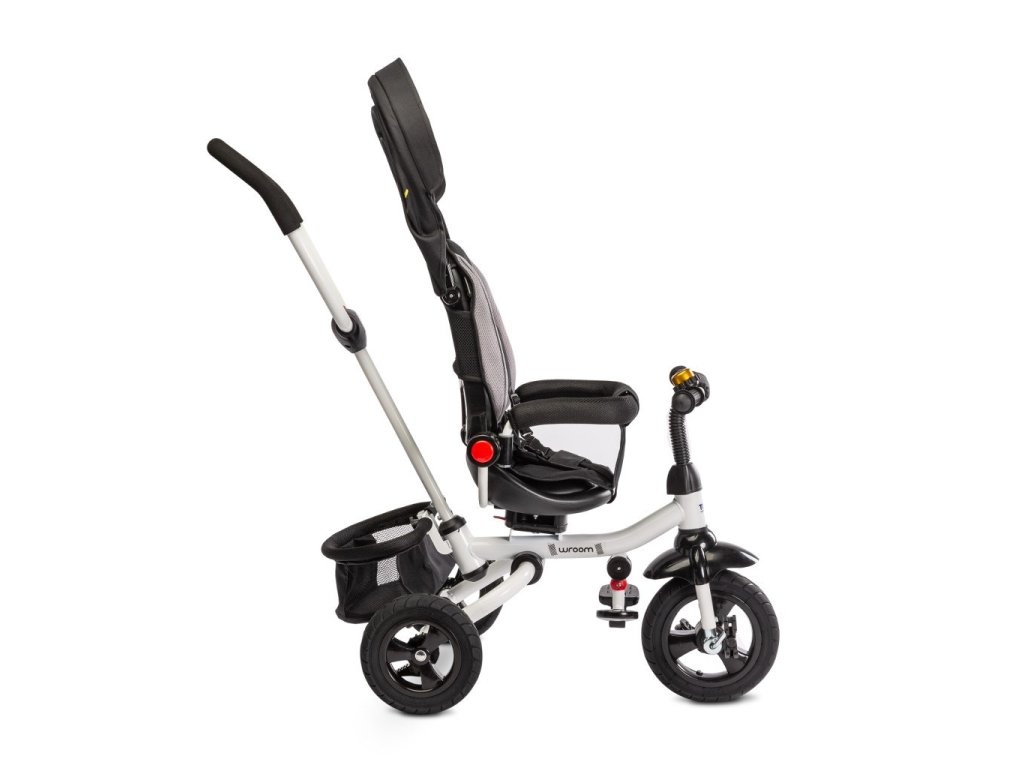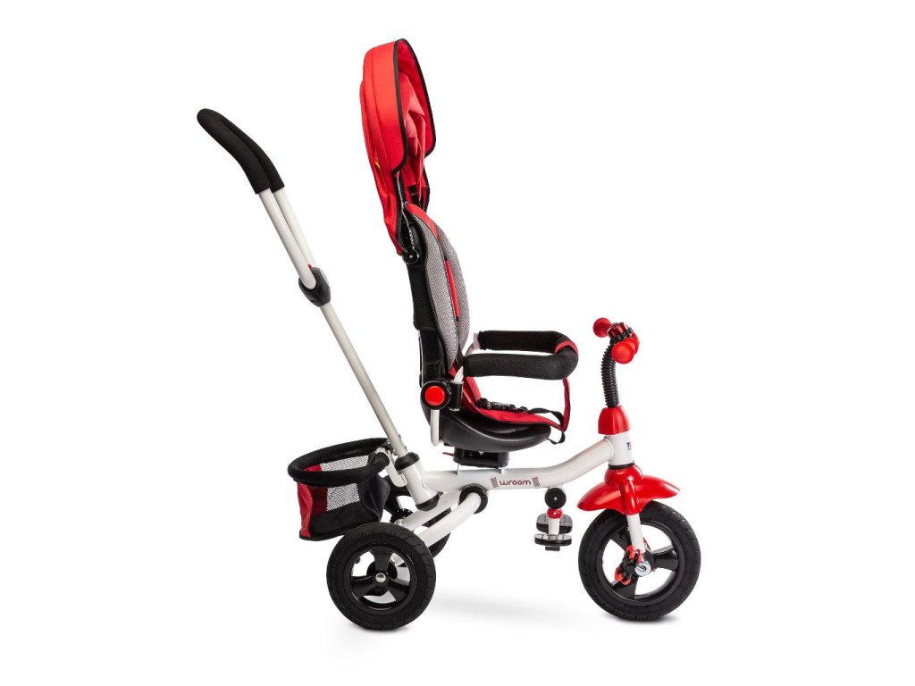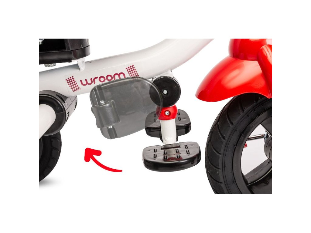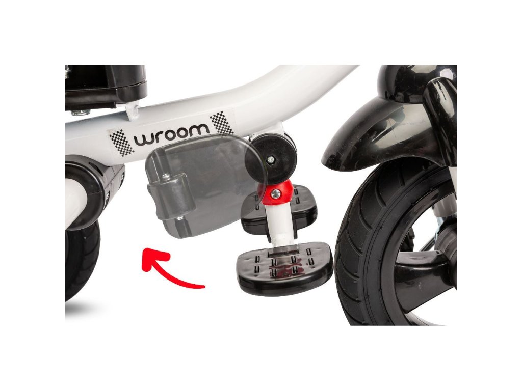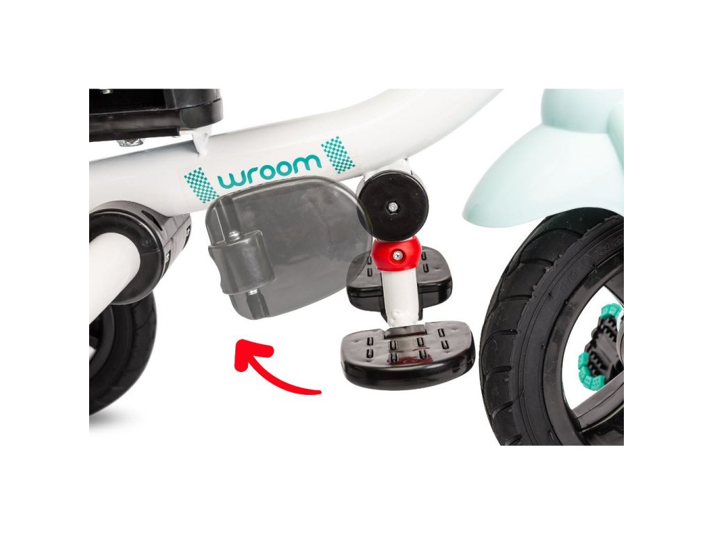 Detská šliapacia trojkolka Wroom s otočným sedadlom je pohodlná trojkolka, ktorú možno použiť dvoma spôsobmi: dieťa sa môže voziť dopredu alebo dozadu proti smeru jazdy a nohy mať položené na sklopnej opierke alebo dopredu jazdiť samo. Rozpojovacia zábrana uľahčuje nasadnutie a jej mäkké polstrovanie zaisťuje bezpečnosť a pohodlie pri jazde. V zadnej časti je košík na drobné predmety a rukoväť pre riadenie s dvojstupňovým nastavením výšky. Trojkolka má kolesá z peny, takže sa nemusíte starať o nafukovanie alebo obávať prepichnutých pneumatík. Obe zadné kolesá majú samostatné brzdy. Skladacia konštrukcia uľahčuje prepravu v kufri a jej skladovanie, keď sa nepoužíva.