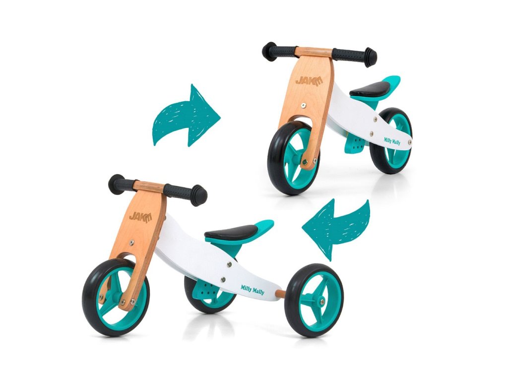 Detské multifunkčné drevené odrážadlo Milly Mally JAKE je ideálne pre deti, ktoré sa práve začínajú učí jazdiť na bicykli a pritom nie sú schopné udržať rovnováhu na dvoch kolesách. Výhodou odrážadlá JAKE je, že z trojkolky sa ľahko stane odrážadlo na dvoch kolesách.
