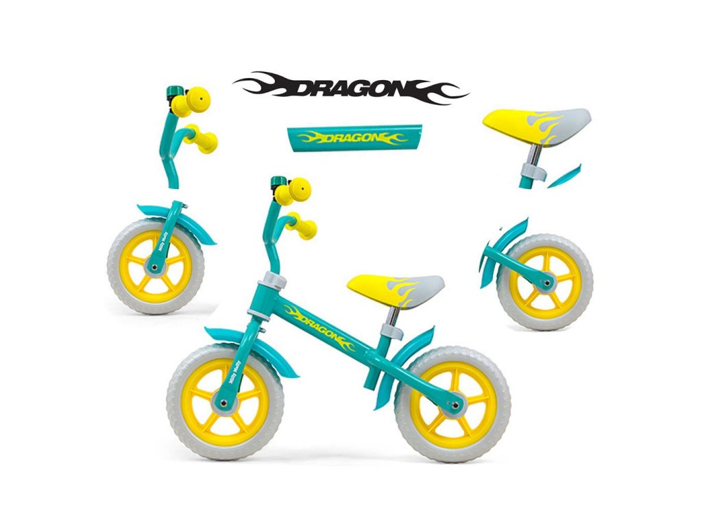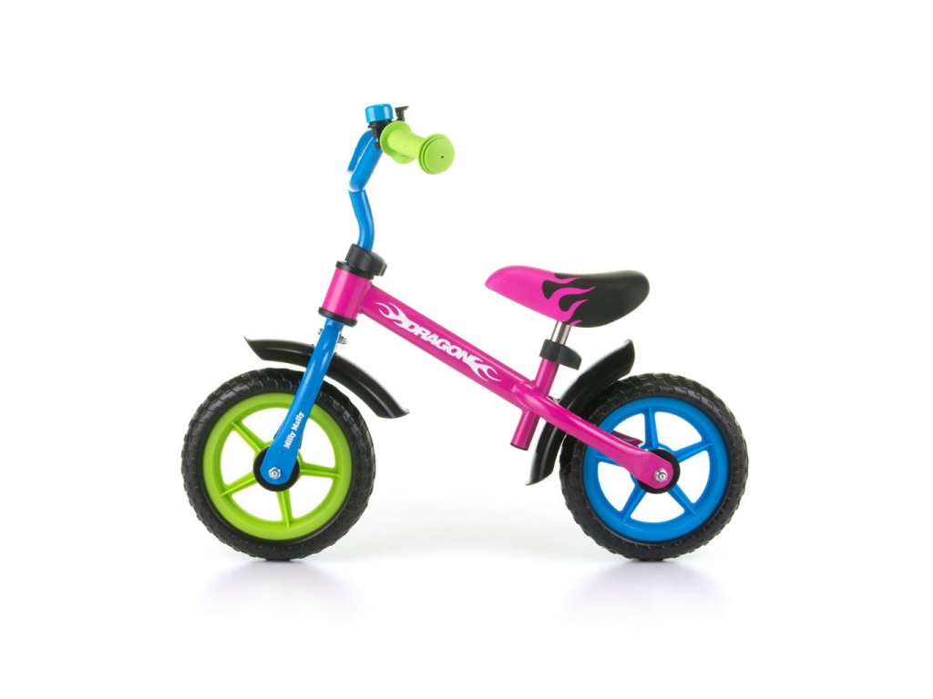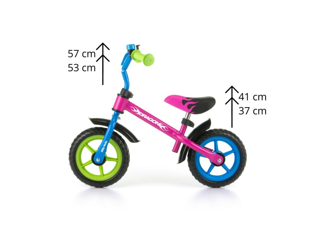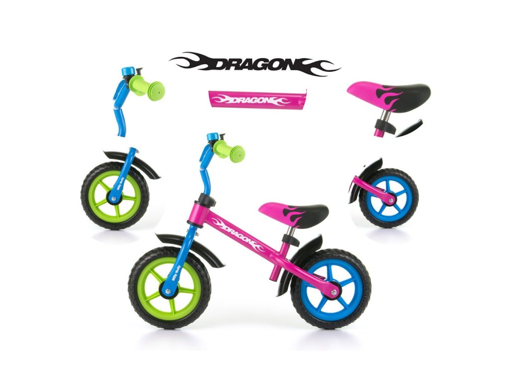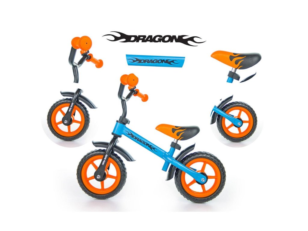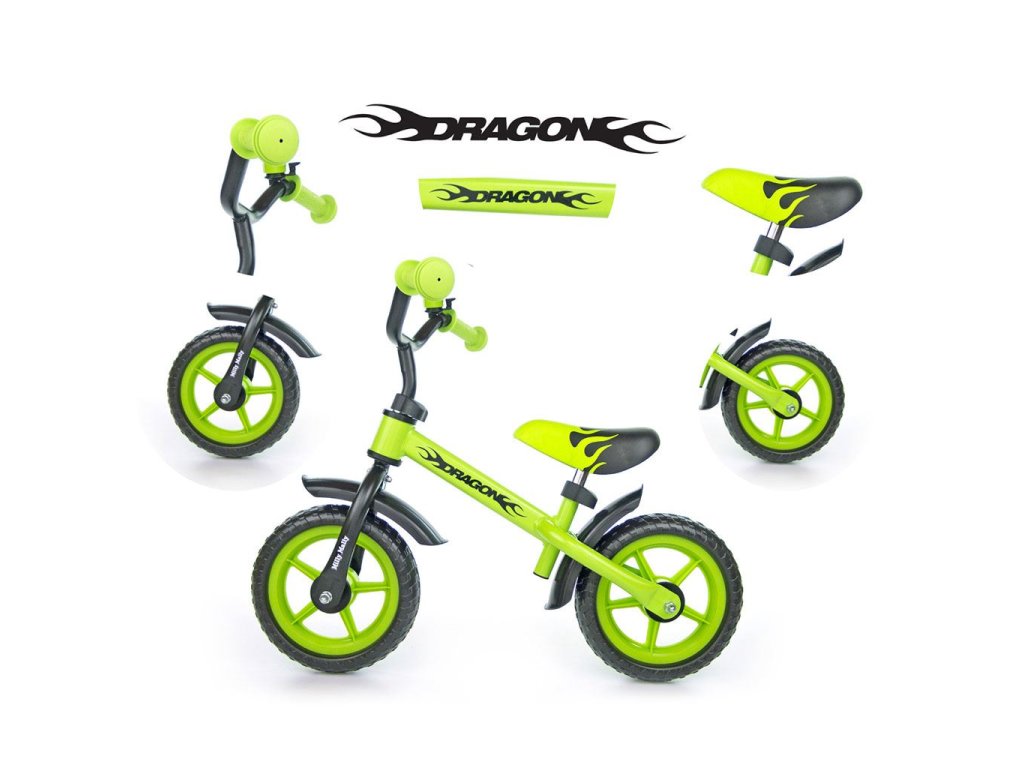 Detské odrážadlo-kolo Milly Mally Dragon je ideálne, keď sa dieťa učí udržať rovnováhu. Je tou najlepšou alternatívou pre bicykel s bočnými kolieskami, takže neskoršie jazda na klasickom bicykli bude oveľa jednoduchšia. Bicykel je bez pedálov, vďaka čomu sa dieťa dokáže sústrediť hlavne na držanie rovnováhy a smer jazdy.