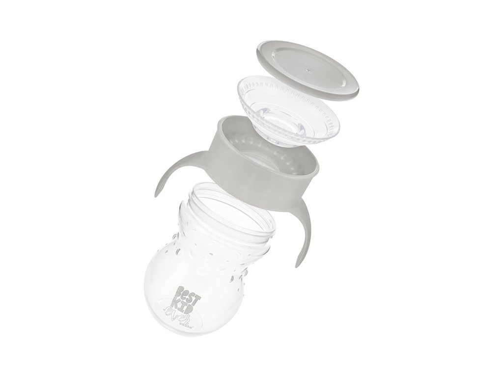 Má uzatvárací ventil, ktorý zabraňuje úniku tekutiny. Náustok umožňuje pitie z ktorejkoľvek strany. Pohodlné široké rukoväte a ergonomický tvar uľahčujú držanie malými ručičkami. Viečko chráni hrnček pred nečistotami. Jednoduché, rýchle a bezproblémové čistenie. Produkt je úplne bez bisfenolu A (0% BPA). Objem 270 ml