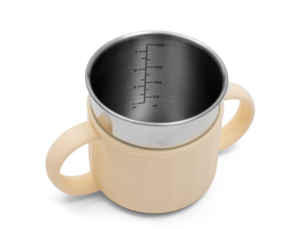 Prémiový materiál: Hrnček je vyrobený z 50 % z mäkkého silikónu a 50 % z nehrdzavejúcej ocele, čo zaručuje odolnosť a bezpečné používanie.