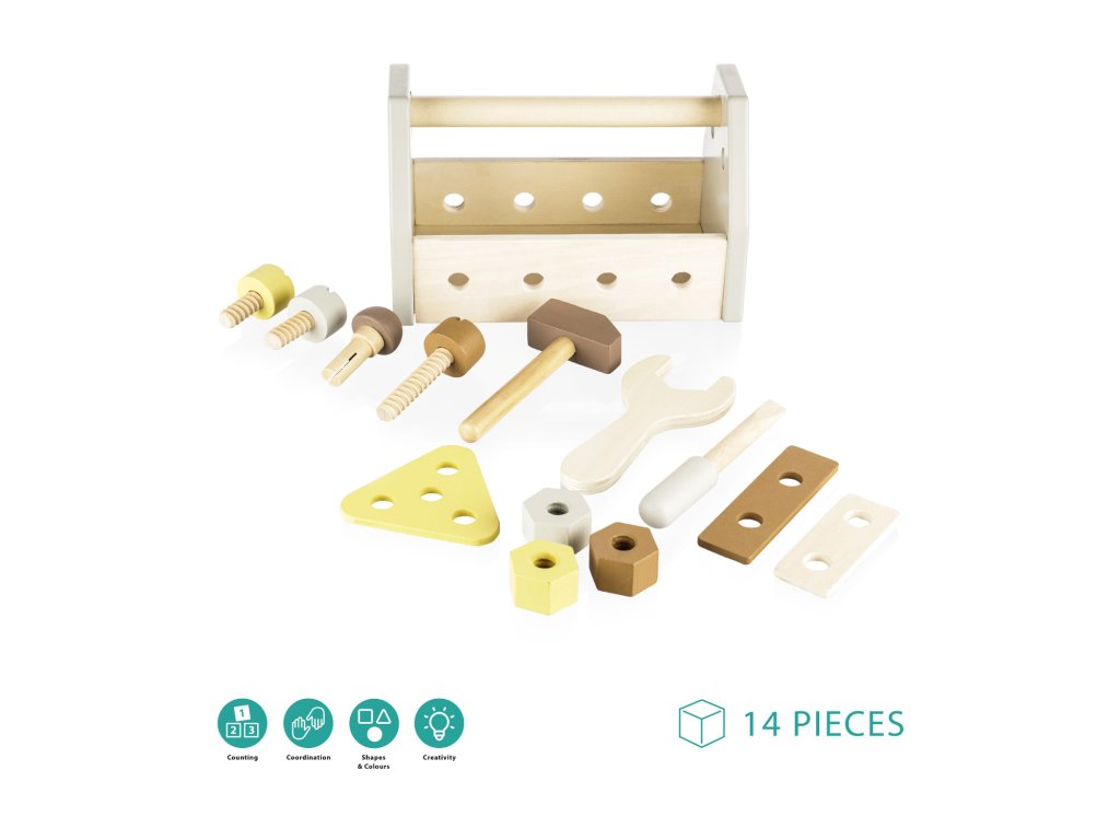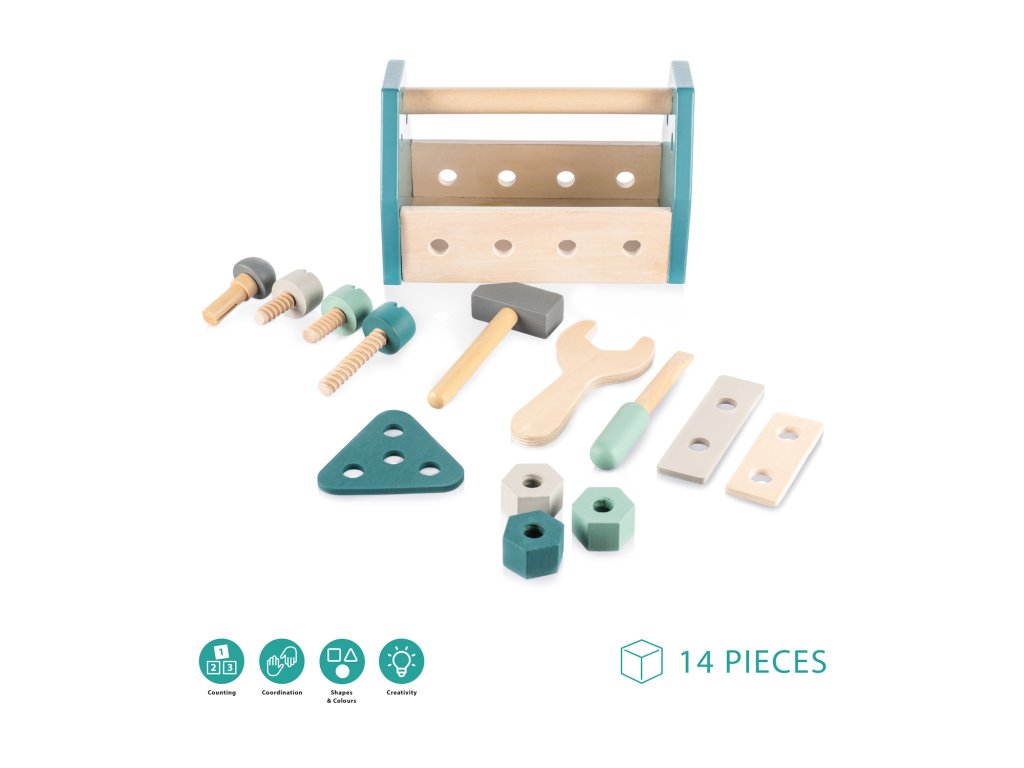 Prvá sada náradia pre malých šikovných staviteľov obsahuje kladivo, skrutkovač, kľúč, 3 matice, 3 skrutky, 1 klinec, 3 drevené komponenty a veľkú škatuľu, do ktorej možno umiestniť všetky časti hračky.