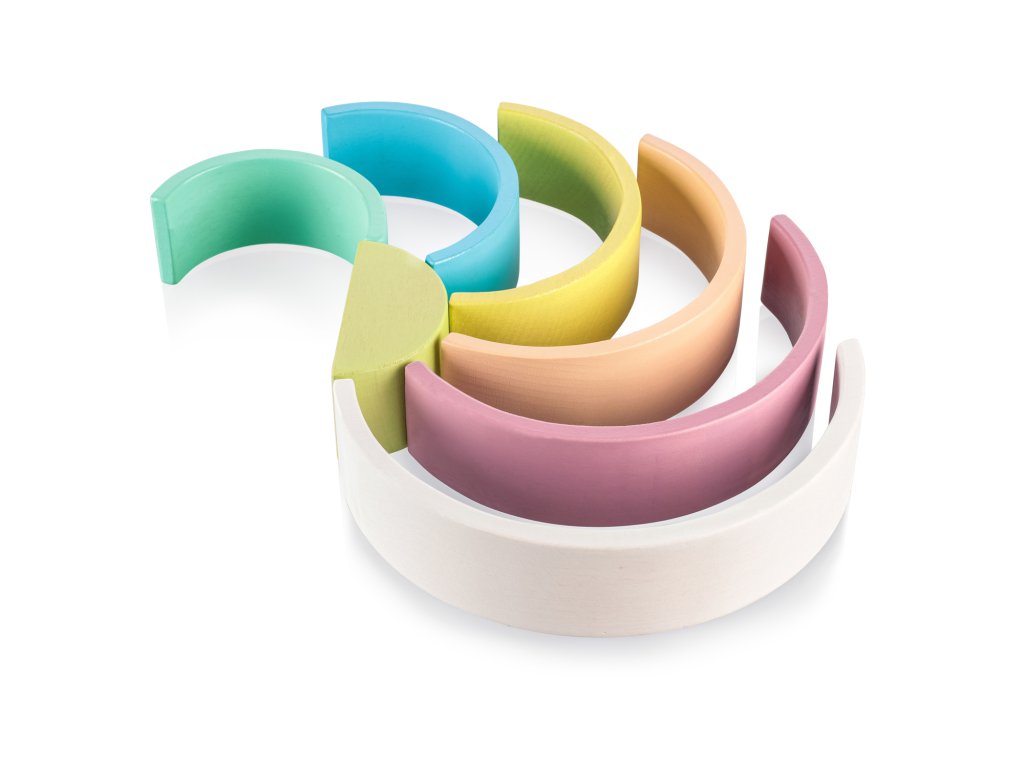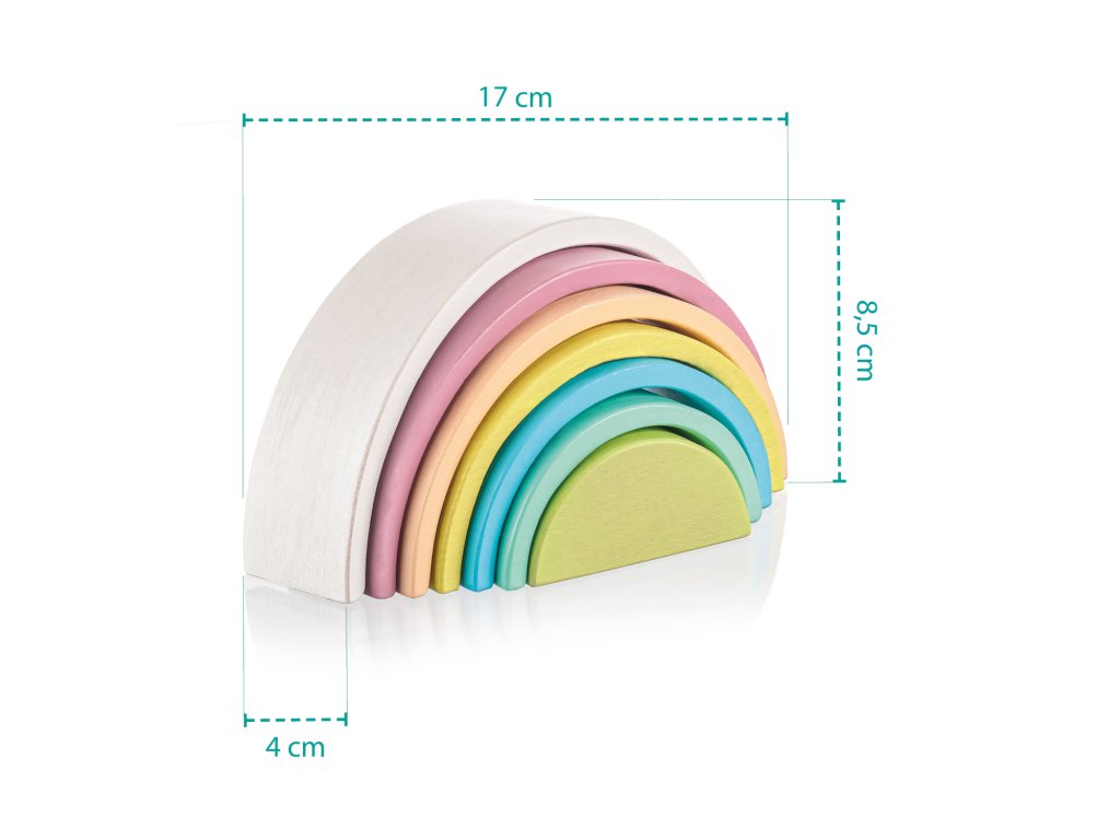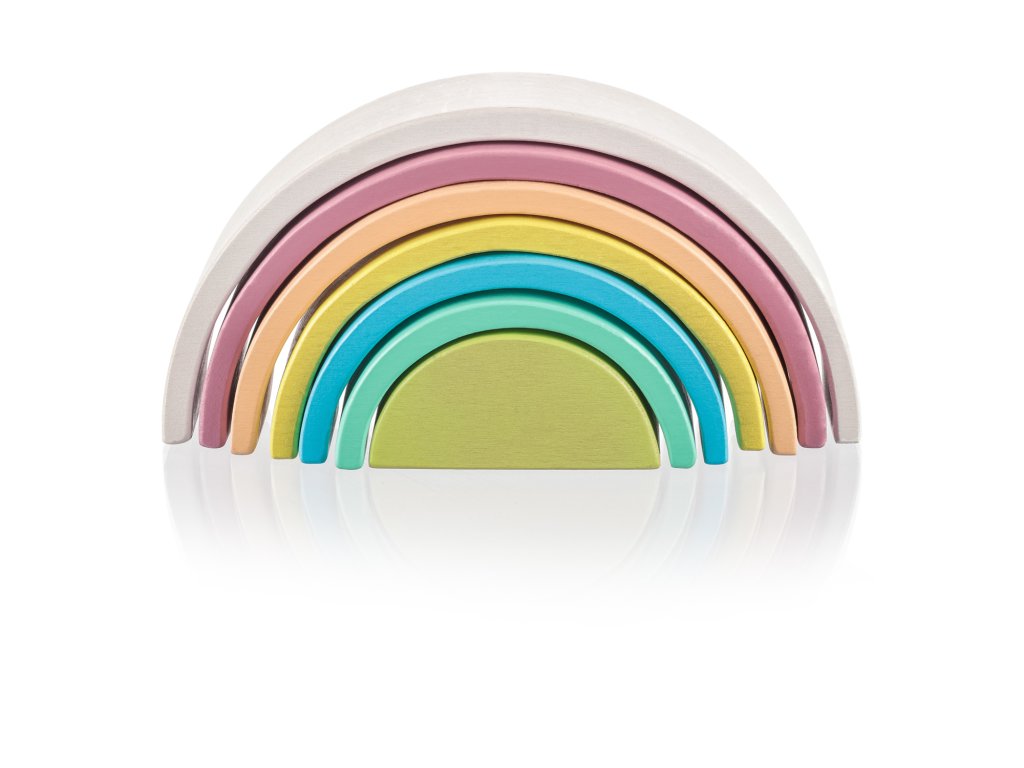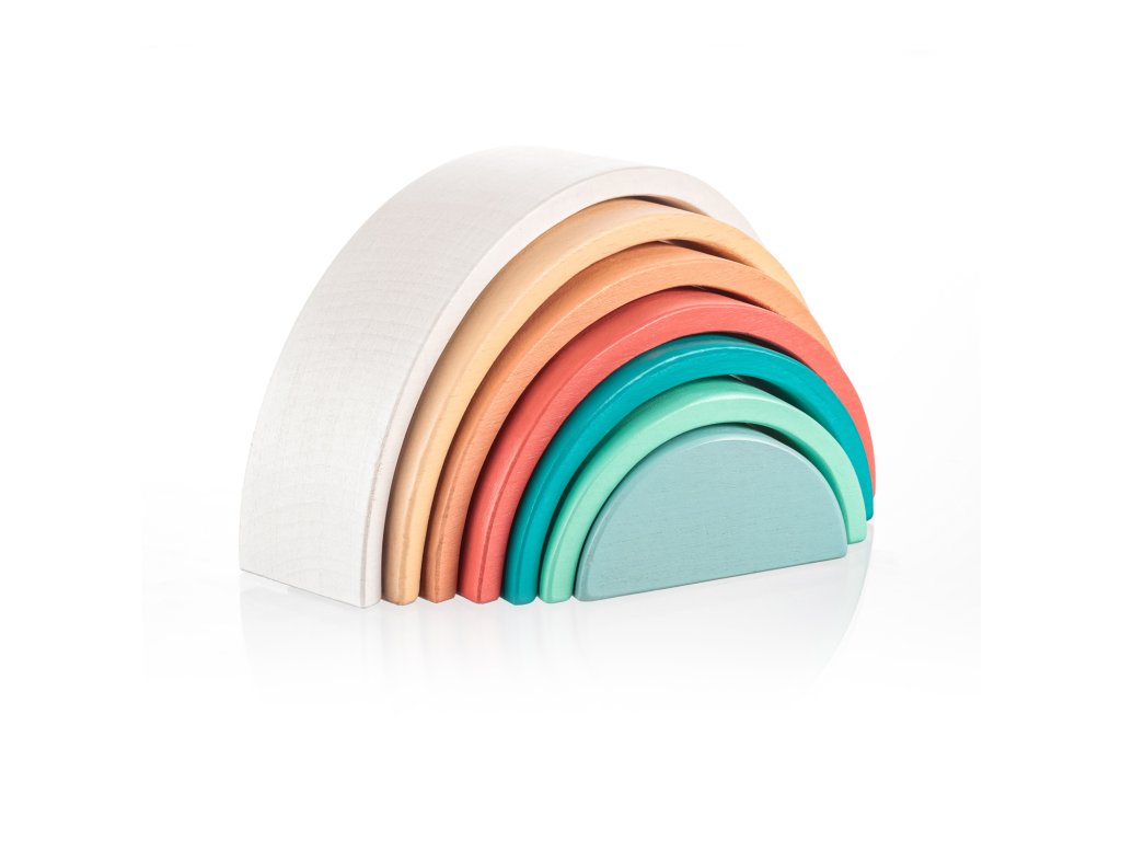 Drevená dúha v pastelových farbách. Vhodné pre deti od 18 mesiacov.
