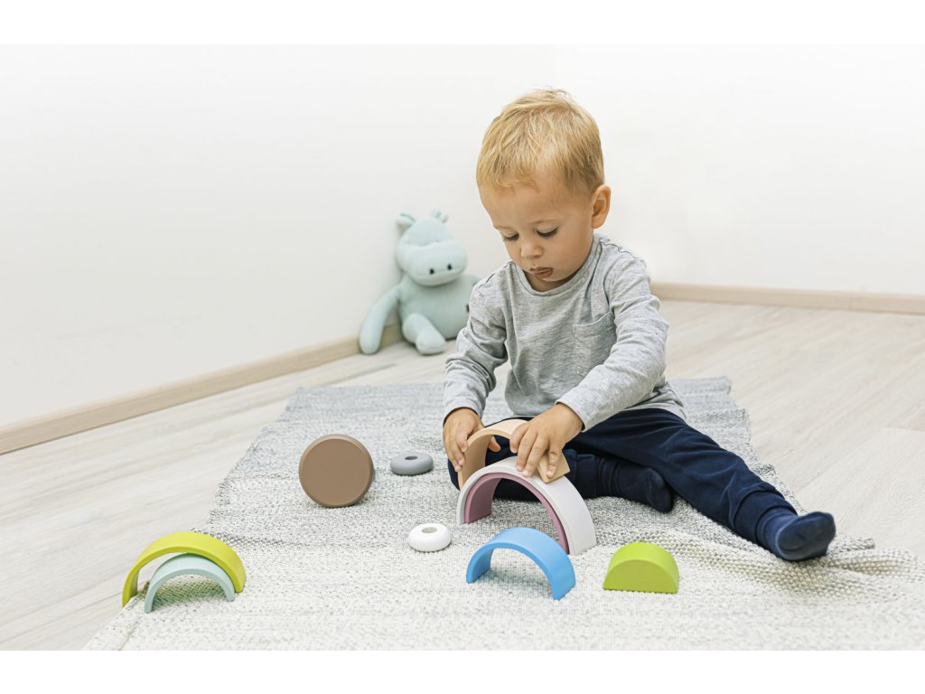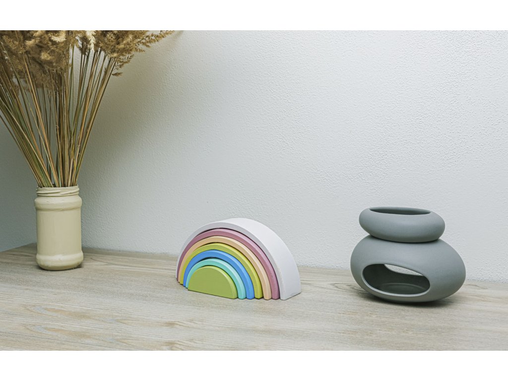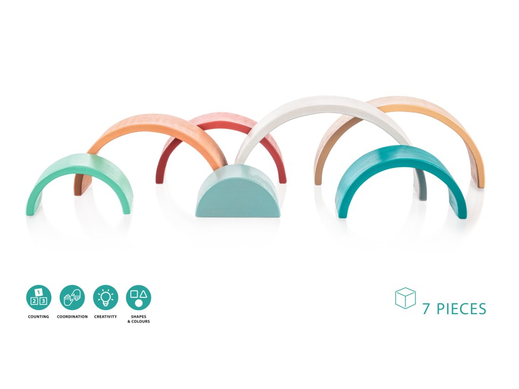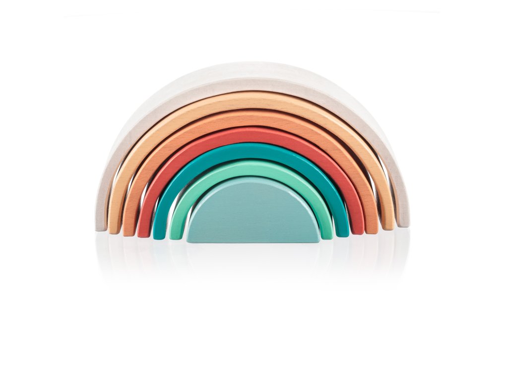 Drevená dúha v pastelových farbách. Vhodné pre deti od 18 mesiacov.