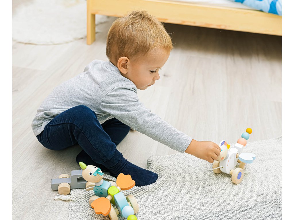 Hračka na ťahanie je ideálnym riešením pre deti, ktoré sa učia chodiť a potrebujú pomoc s motiváciou. Pri chôdzi sa krídla a chvost draka rozkývajú pomocou jednoduchého mechanizmu, ktorý dieťa zabaví na celé hodiny. Hračka rozvíja základné zmysly, motoriku a koordináciu.
