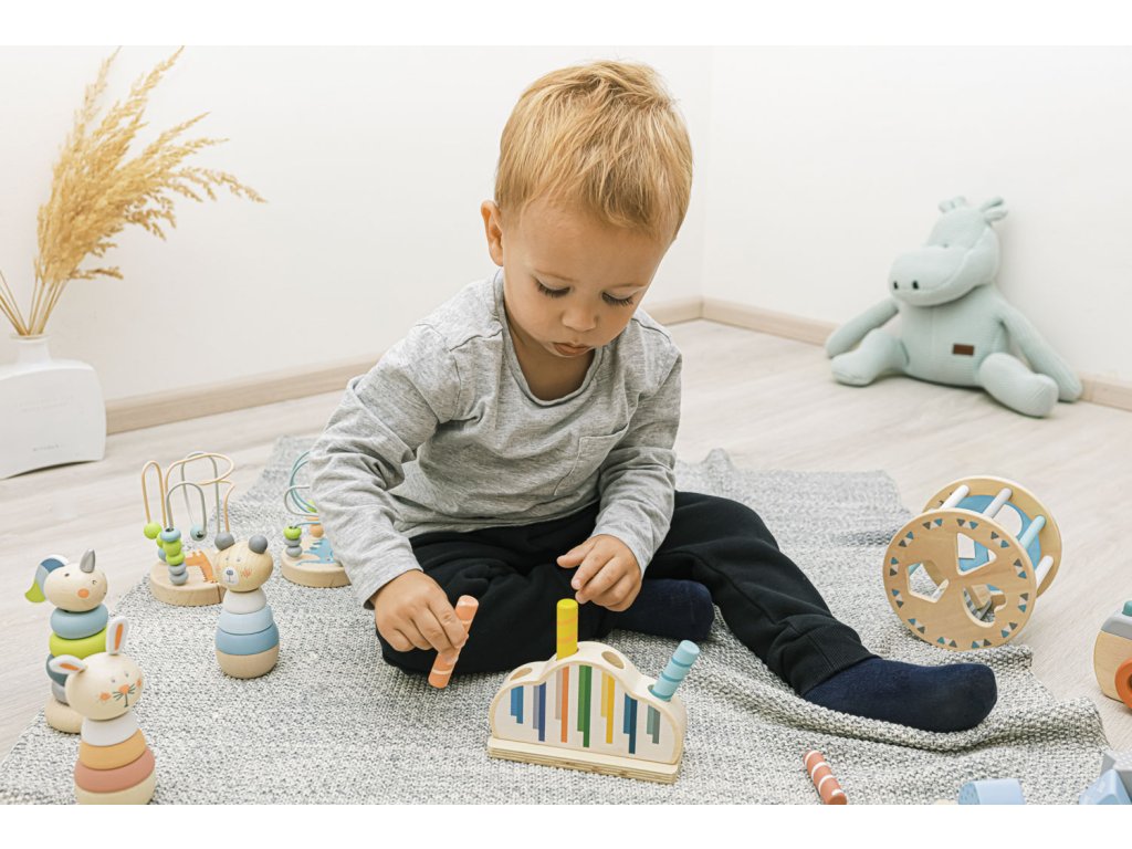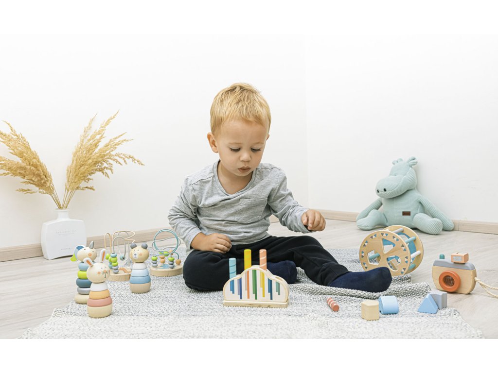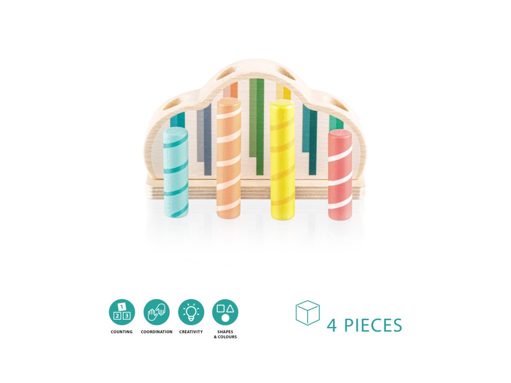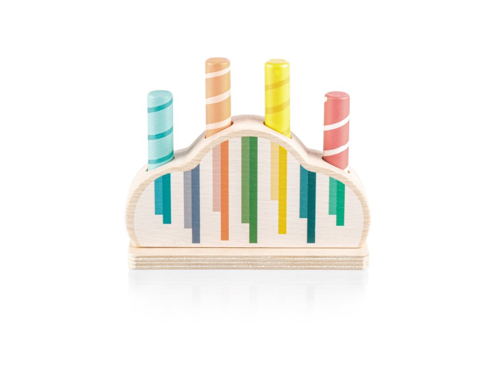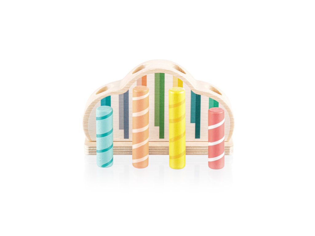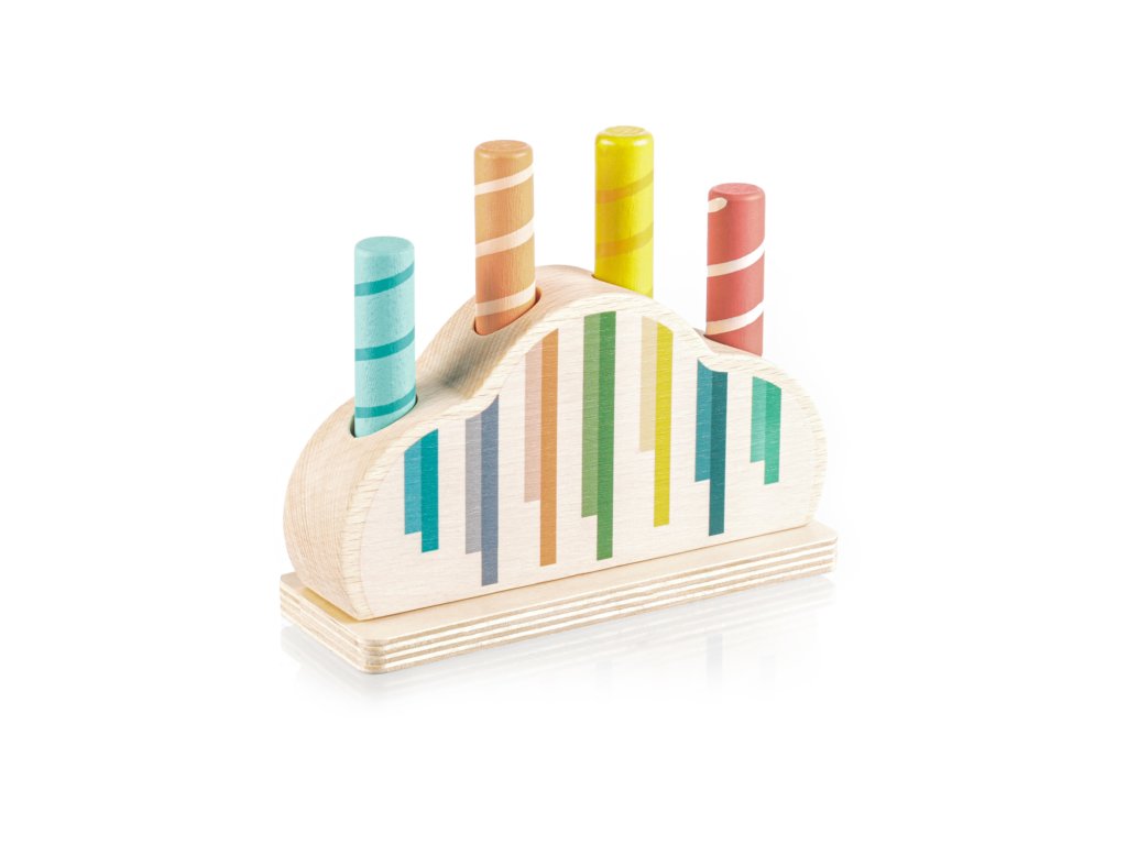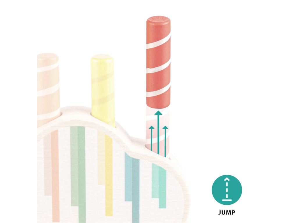 Zabavte svoje dieťa na dlhé hodiny s vyskakovacou drevenou hračkou. Tri farebné kolíky s motívom mesiaca a hviezdy sú upevnené v drevenom podstavci s pružinami. Keď tieto kolíky jemne stlačíte, uvoľnia sa a pružina ich nechá vyskočiť. Hračka rozvíja motorické zručnosti, koordináciu a sústredenie, takže je ideálna na skoré učenie. Vyrobené z prírodného bukového dreva.