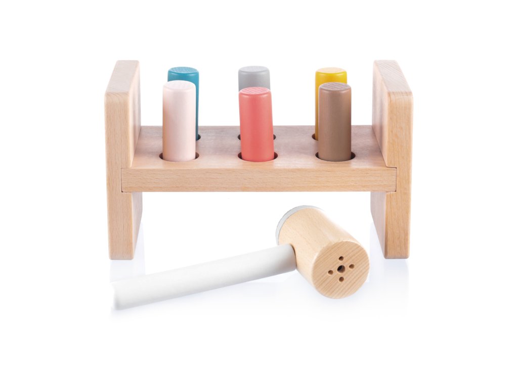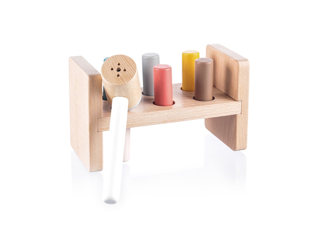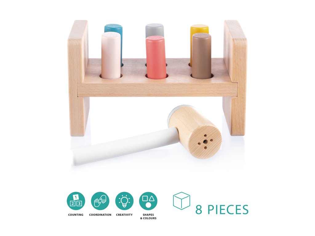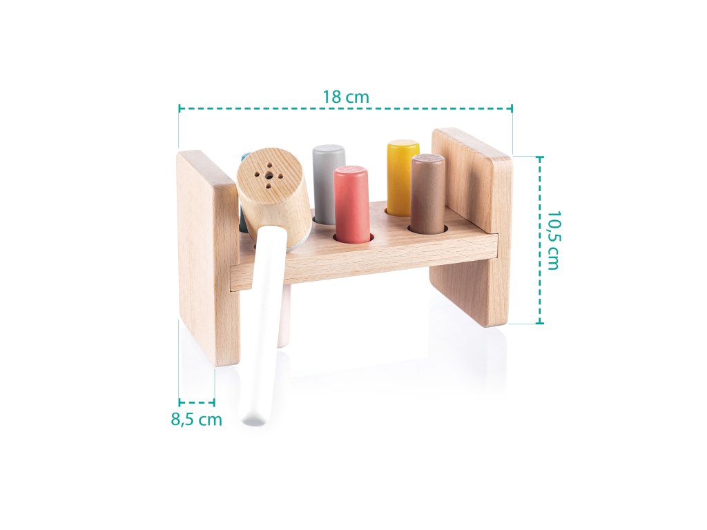 Drevené kladivo pre malé deti, ktoré ich zabaví na celé hodiny. Obsahuje drevený stôl s otvormi, 6 farebných kolíkov a kladivo.
