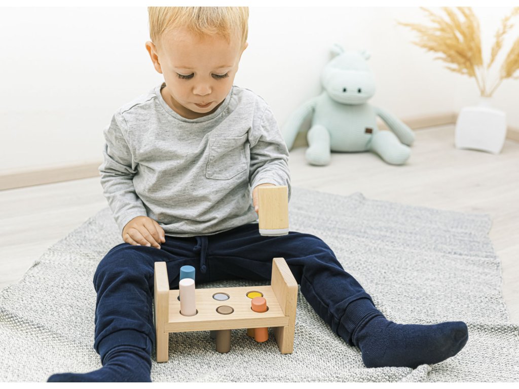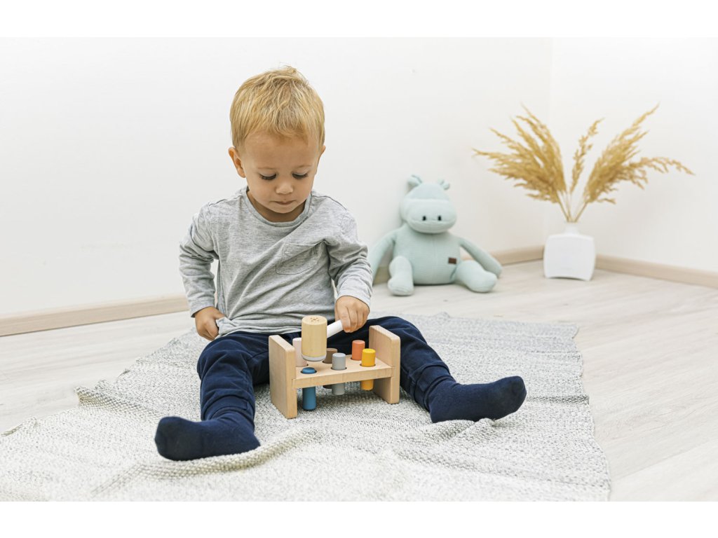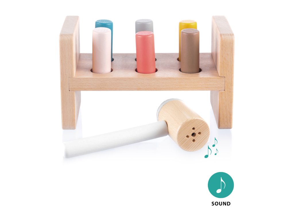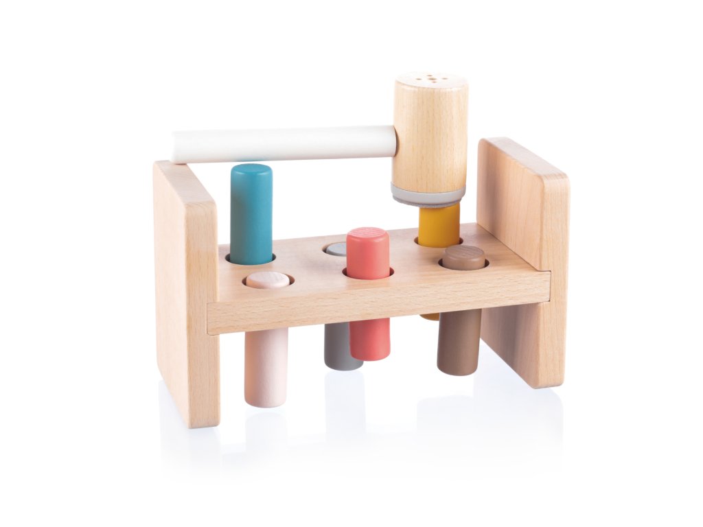 Drevené kladivo pre malé deti, ktoré ich zabaví na celé hodiny. Obsahuje drevený stôl s otvormi, 6 farebných kolíkov a kladivo.