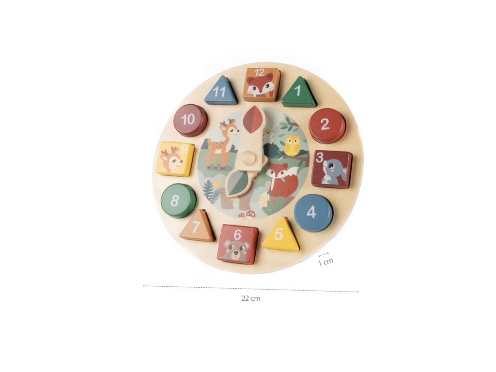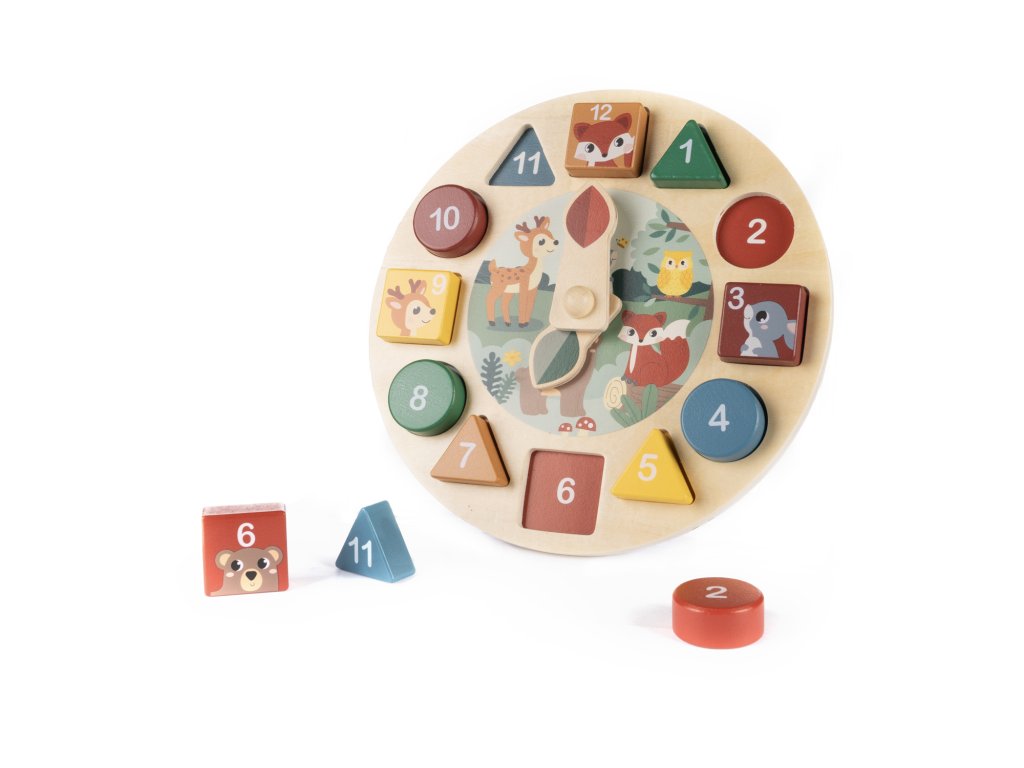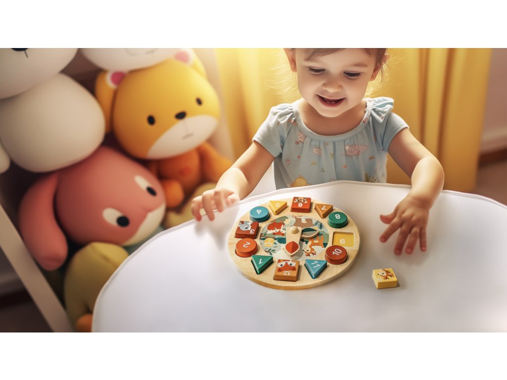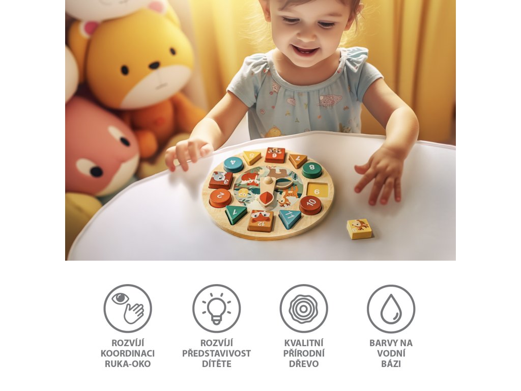 spôsobom prostredníctvom hry. Tieto drevené hodiny s aktivitami ponúkajú