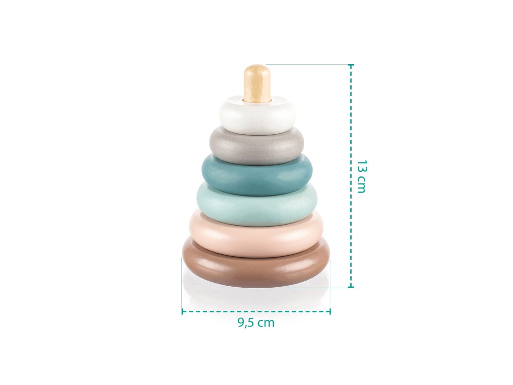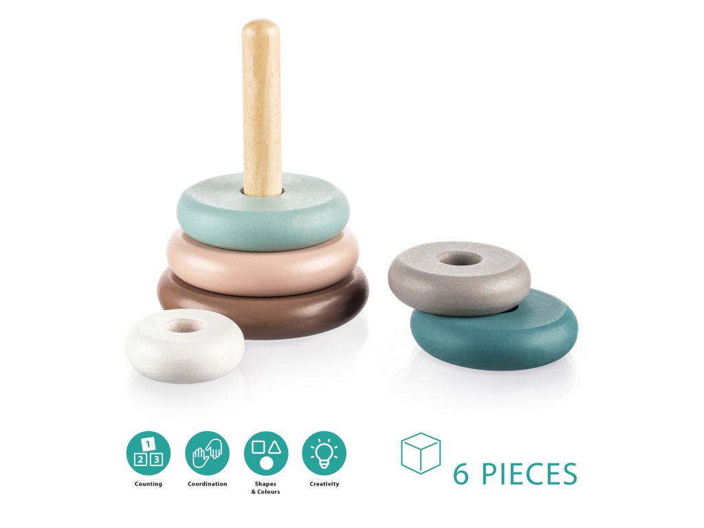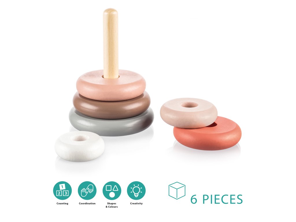 Súprava sa skladá zo 6 kusov rôznych veľkostí, ktoré možno ľubovoľne stohovať. Hračka zabaví vaše dieťa na dlhý čas a navyše mu pomôže naučiť sa nové zručnosti, ako sú farby, čísla a veľkosti.