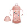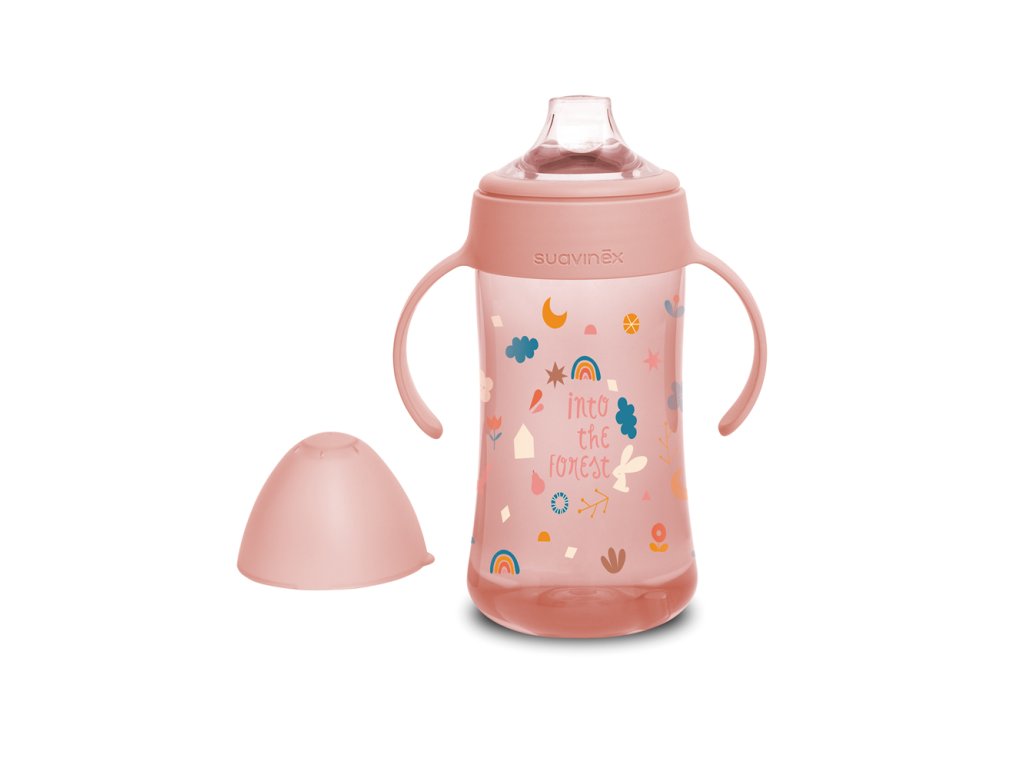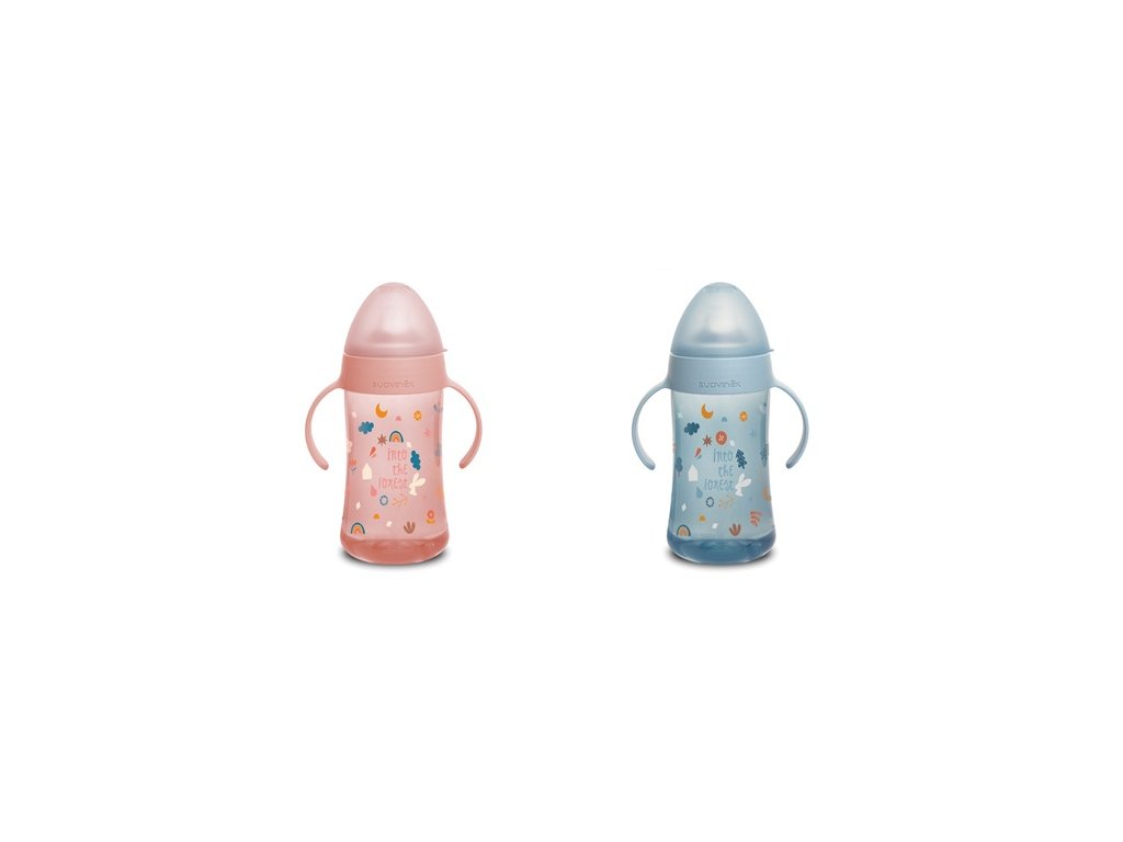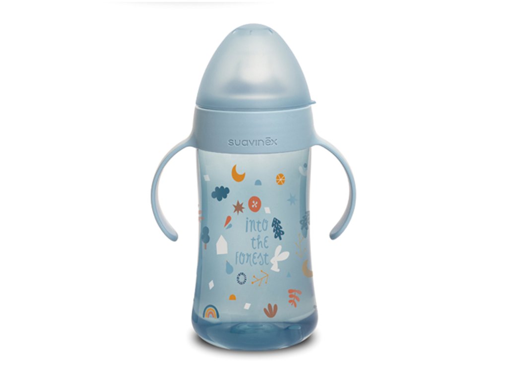 Druhá fľaša s uškami so špeciálnym cumlíkom uľahčuje prechod z dojčenskej fľaše na pitie z hrnčeka či pohára. Silikónový náustok je mäkký a materiálovo zhodný s cumlíkmi dojčenských fliaš, preto ho Vaše deti prijmú rýchlejšie ako bežná tvrdá pítka. Prvá fľaša má ergonomický tvar a držadlá vhodná pre drobné detské ruky, ktoré umožnia jej ľahké uchopenie.