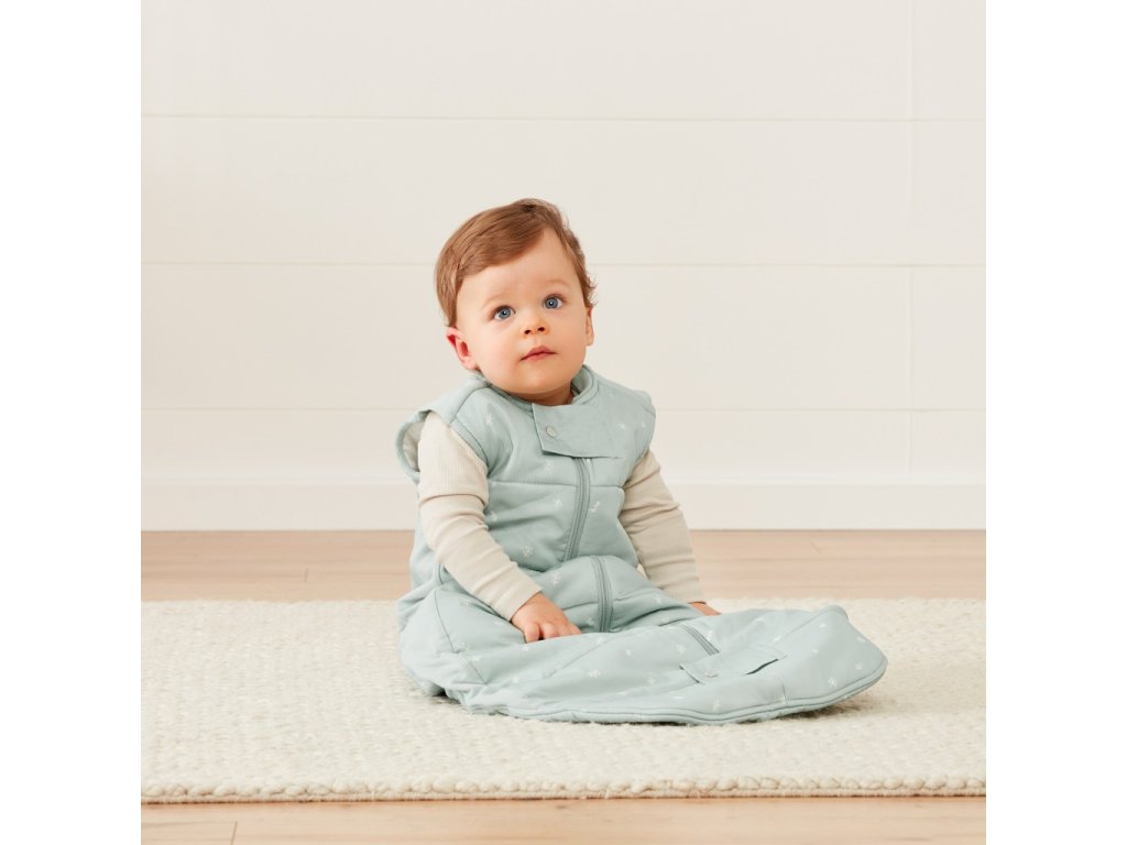 Vak na spanie Sheeting 2,5 TOG je ideálny na udržanie tepla pre dieťa počas noci v miestnostiach s teplotou 17–23 °C. Hodnota 2,5 TOG znamená, že pri používaní tohto výrobku nie sú potrebné ďalšie prikrývky v postieľke, čo z neho robí možnosť bezpečného spánku. Rodičia si môžu byť istí, že priedušné organické prírodné vlákna pomáhajú regulovať teplotu dieťaťa a zabraňujú prehriatiu. Rodičia sa môžu riadiť izbovým teplomerom ZDARMA a príručkou What to Wear (Čo si obliecť), ktoré sú súčasťou výrobku, a vhodne pod ne navrstvovať vrstvy, aby ich dieťa zostalo v teple.