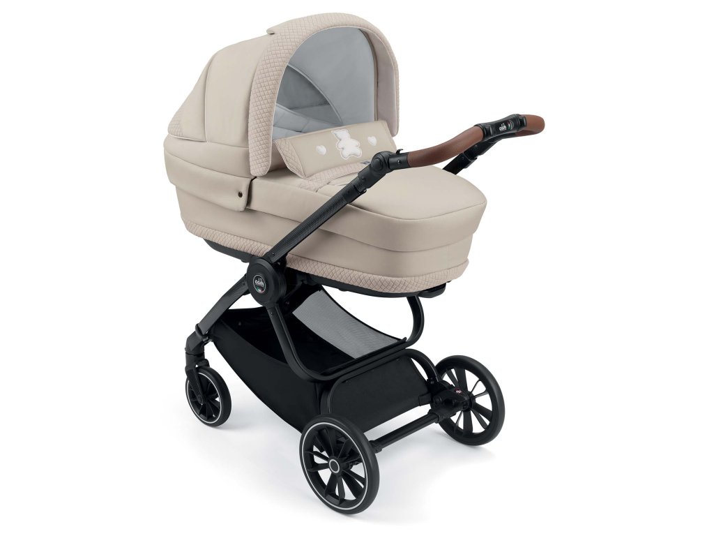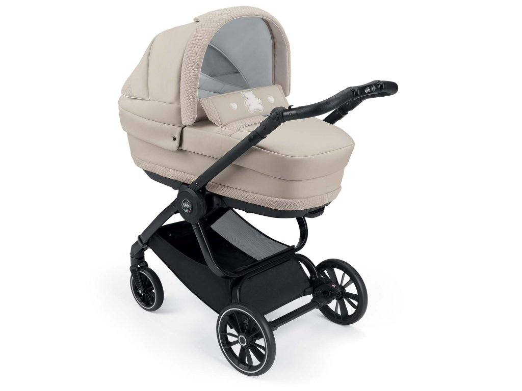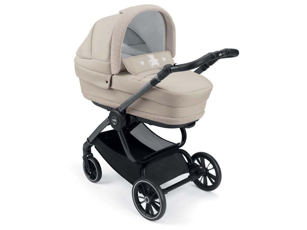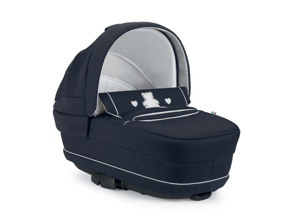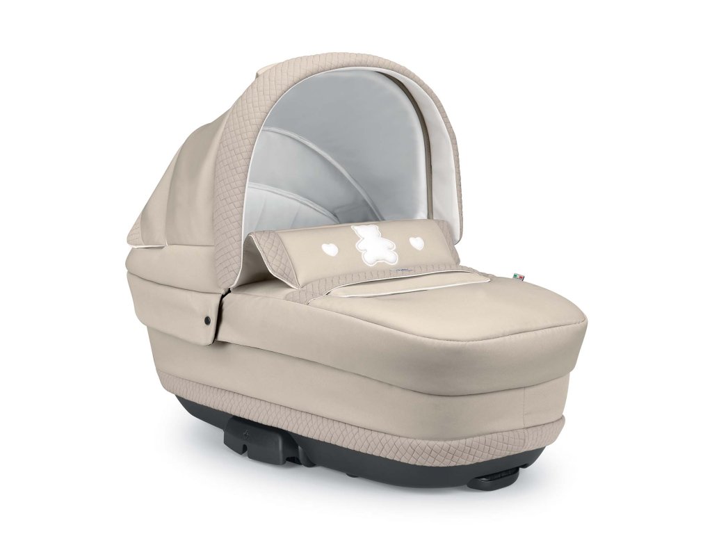 Priestranná korba je potiahnutá prešívanou látkou v romantickom prevedení – s ozdobným bielym prešívaním a motívom medvedíka a dvoma srdiečkami. Pre bezpečnejšiu manipuláciu vanička disponuje jednoduchým systémom odopnutia z podvozku, a to iba pomocou jednej poistky. Po vyklopení vzpier na spodu vaničky sa dá dokonca použiť ako kolíska, čo iste využijete na ľahšie zaspávanie dieťatka doma či na cestách. Rytmické pohyby totiž malé deti milujú. Pripomína im dobu, kedy boli ešte u mamičky v brušku. Navyše, pre dieťatko sa vám môže hodiť tiež výškové polohovanie hlavičky.