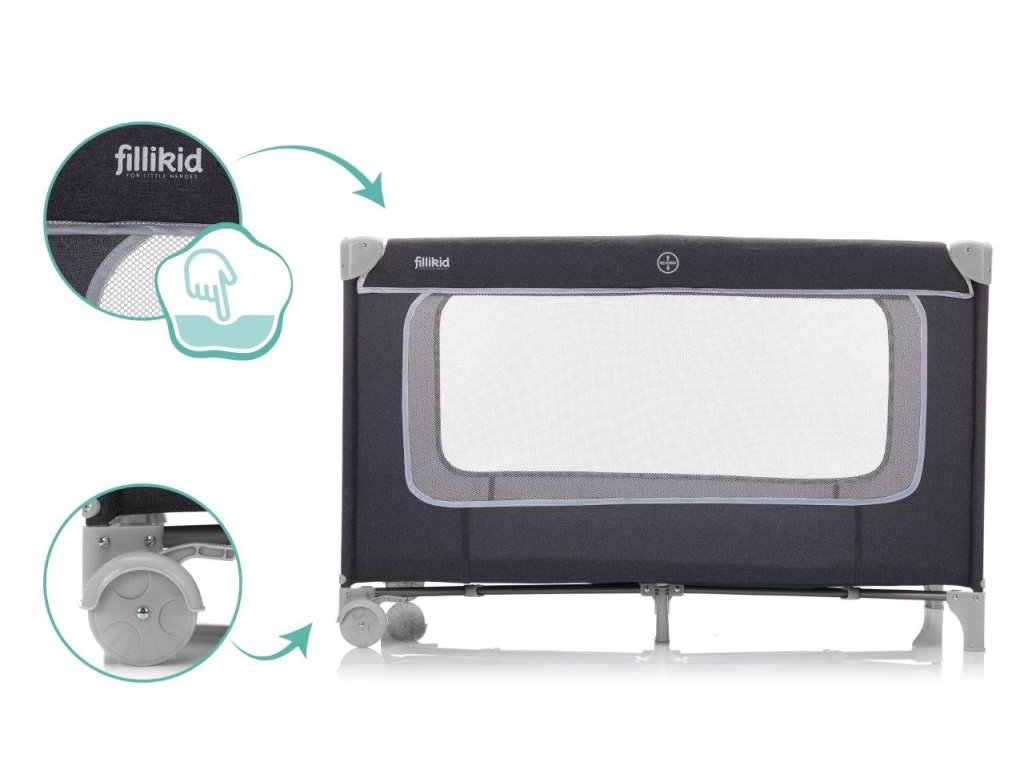 Cestovní postýlka s komfortní matrací od Fillikid byla vyvinuta s velkým cílem, aby cestování se skládací dětskou postýlkou bylo co nejjednodušší a nenákladné, aniž byste se museli obejít bez jakéhokoli pohodlí. Tato postel s komfortní matrací v ceně vám ušetří dokupování matrace do cestovní postýlky a přesto se vaše dítě nemusí obejít bez výhod dobré matrace. Je to téměř jediná cestovní postýlka na trhu, která je dodávána nejen s lehce polstrovaným základem, kterému se u mnoha cestovních postýlek často mylně říká matrace, ale se skutečnou matrací o tloušťce 3 cm. Přiložená matrace je vyplněna speciální studenou pěnou, která Vašemu dítěti nabízí co největší pohodlí a zároveň dostatečnou tuhost. Navíc matrace je snímatelná a pratelná a lze ji snadno složit kolem lůžka pro přepravu a uložit do přiložené tašky. Protože k této posteli nepotřebujete extra matraci do cestovní postele, ušetříte na jedné straně peníze a také místo při cestování nebo při skladování doma. Cestovní postýlka s komfortní matrací je proto ideální i jako přistýlka pro příbuzné nebo do druhého domova. Cestovní postýlka je nejen praktická, ale i vizuálně poutavá: kvalitní melanžový potah v šedé barvě velmi dobře ladí s obývacím pokojem a má kvalitní a moderní vzhled. Velké síťované plochy poskytují dostatečnou ventilaci a protiskluzový otvor se zipem umožňuje vašemu malému miláčkovi samostatné nastupování a vystupování. S pomocí fixovatelných koleček se postel také velmi snadno přemisťuje.