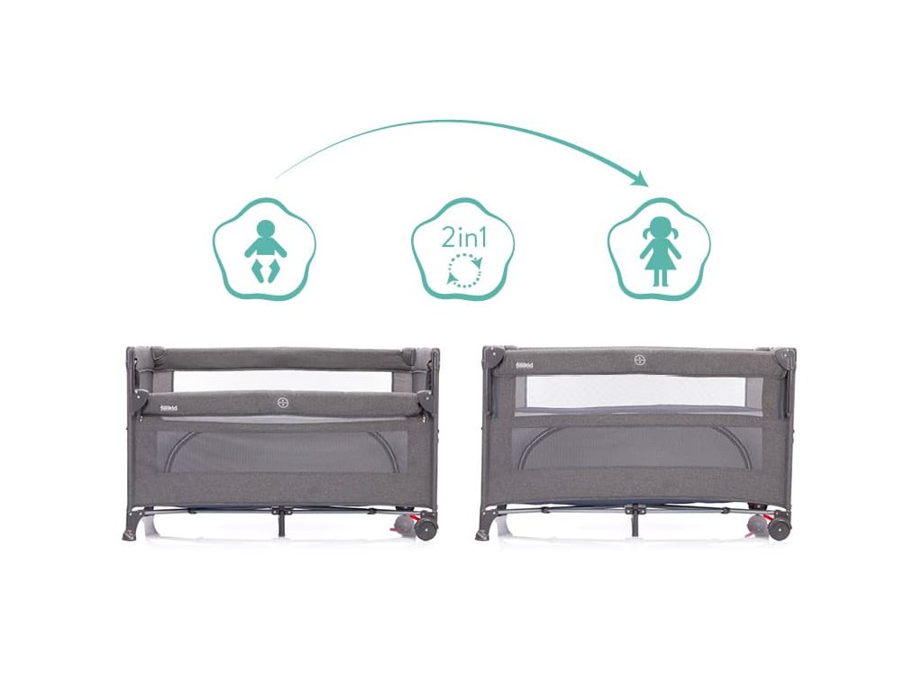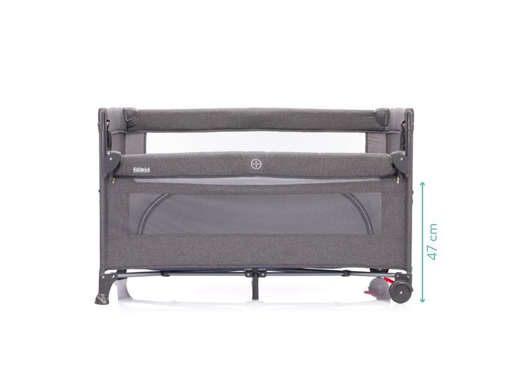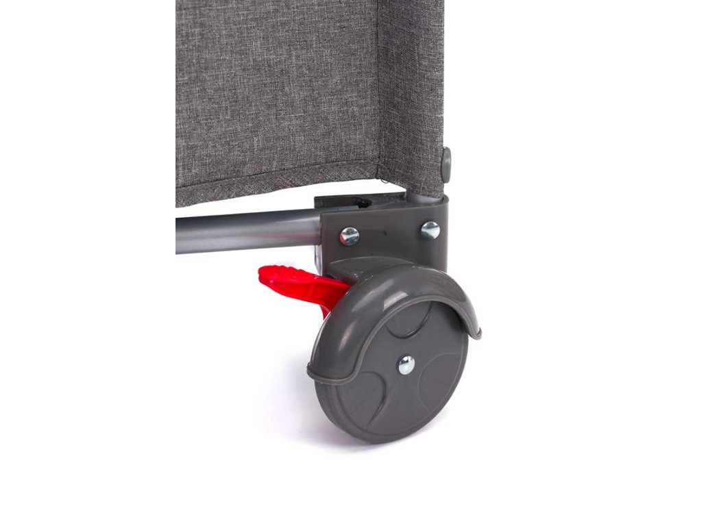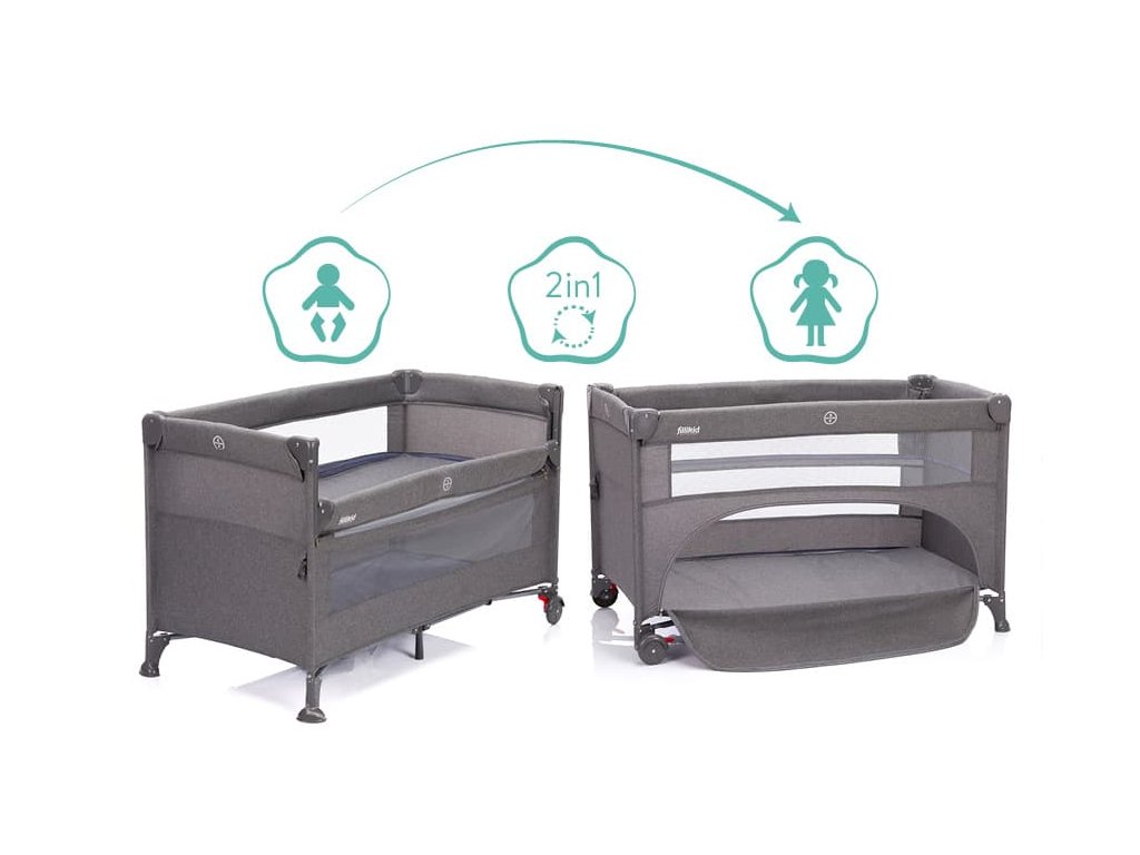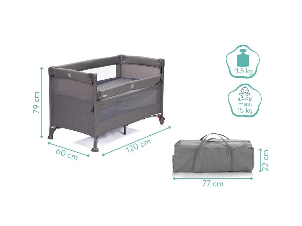 Tato postýlka má tři stabilní nohy a dvě praktická kolečka s brzdou, takže postýlku můžete snadno přemisťovat po pokoji. Boční část tvoří prodyšná síťovina, která zaručuje klidnější spánek. Díky praktickému průlezu na široké straně postýlky vaše dítě samo vyleze. Průlez lze snadno otevřít a zavřít pomocí zipu.Postýlka má výškově nastavitelné dno.