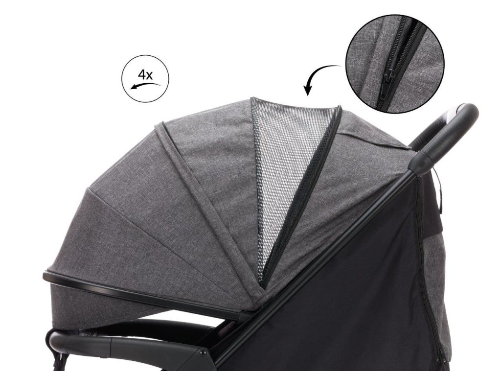 Díky lehkému rámu je kočárek skvěle ovladatelný a prodlužovací stříška chrání vašeho malého miláčka před přílišným sluncem, větrem nebo deštěm. Velká větrací síť na zadní straně kočárku zajišťuje správnou cirkulaci vzduchu i v horkých dnech. Zádová opěrka nastavitelná do 3 poloh a opěrka nohou nastavitelná do 4 pozic se přizpůsobí potřebám vašeho dítěte. S 5bodovým bezpečnostním pásem a odnímatelnou PU koženým madlem jste na cestách vždy v bezpečí.