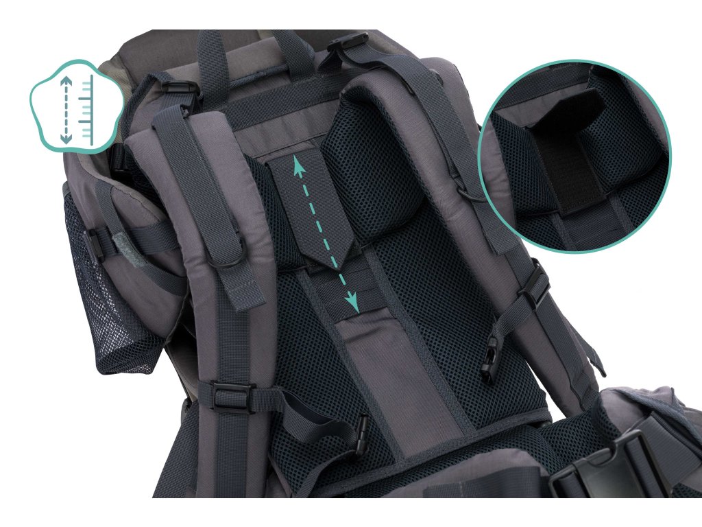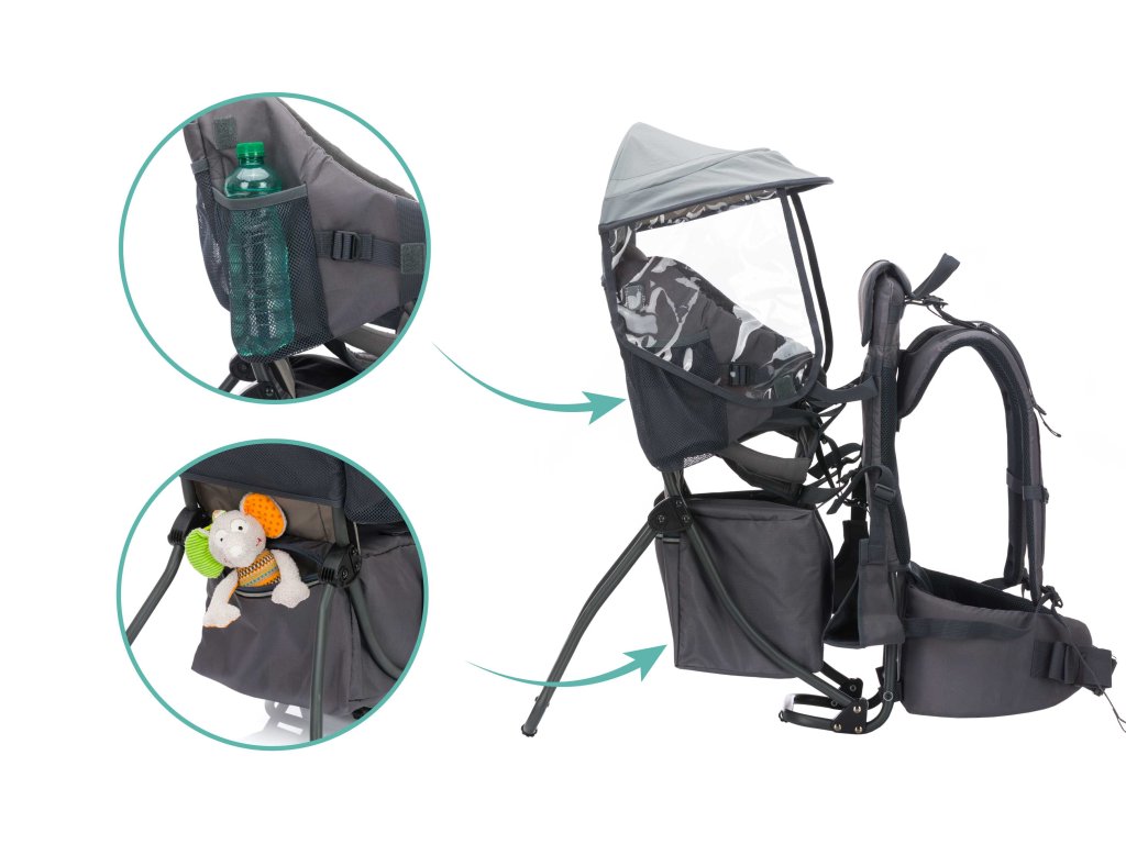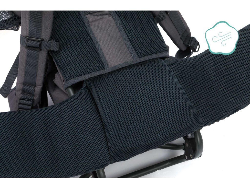 Vzduchový ventilační systém zádové opěry a nosné popruhy zajišťují příjemné chlazení. Velký úložný prostor pod sedadlem dítěte umožňuje přepravu různého nádobí. Další 2 přihrádky na láhve poskytují dostatek místa pro láhve na pití.